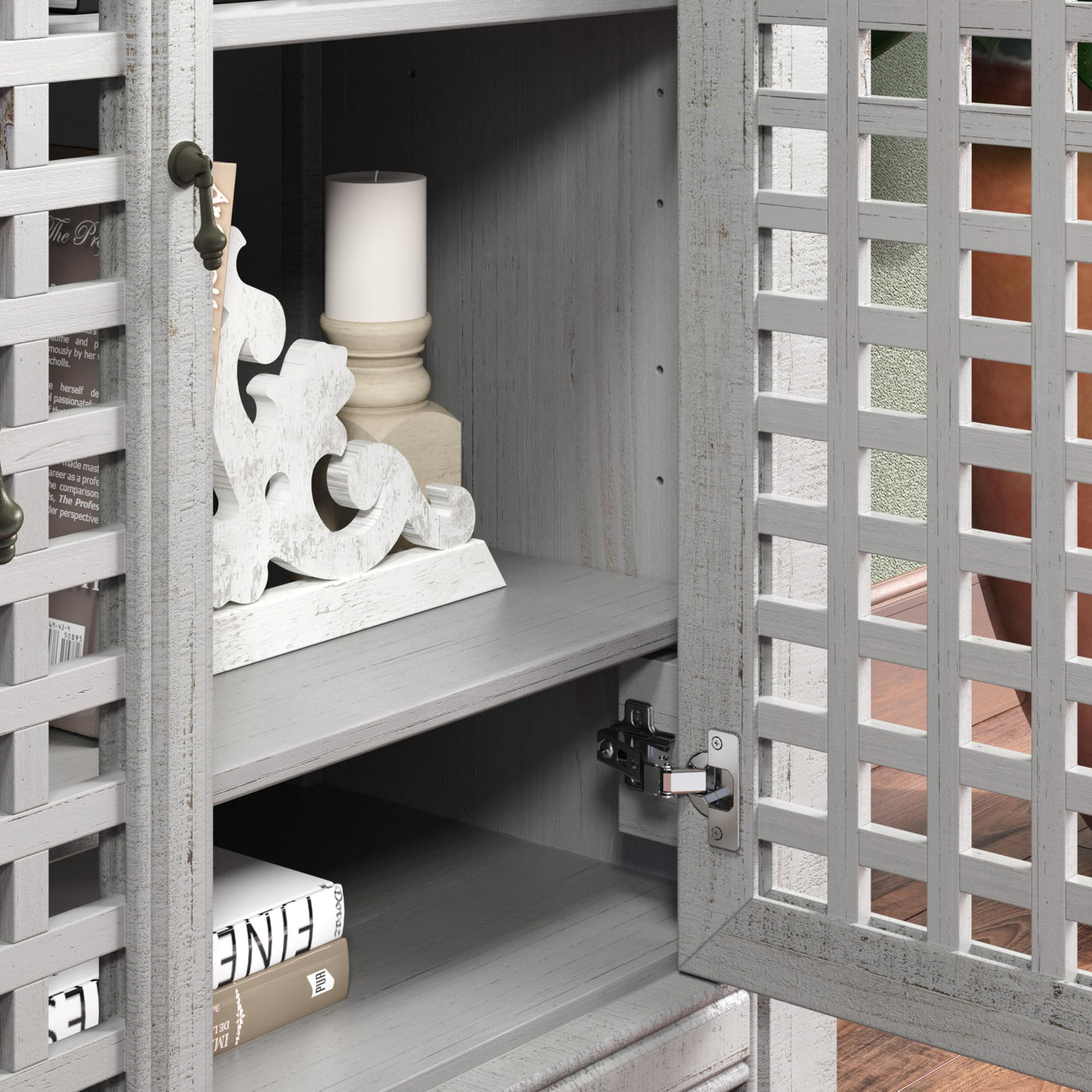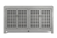 The heirloom feel and antique pie-safe design of the Rio 4-Door Accent Cabinet is built for todays home accents and electronics. The spacious 70" cabinet has four adjustable shelves behind lattice door fronts for a semi-open display or use with an electronic remote. The well worn look of the distressed, antiqued finish warms the room and is available in your choice of Gray, Navy and Mocha. Your purchase includes one accent cabinet.Features :- Pine solids/MDF- Antiqued Powder Gray- Constructed of pine solids and engineered wood back- Antique pie-safe design- Latticework doors allow for use of remotes- Four adjustable shelves behind doors- Recessed European-style door hinges- Artisan hand-rubbed distressed finish with antique rub-through- Anti-tip kit included.Specifications :- Product Dimensions : 38"H x 70"W x 16"D- Product Weight : 120 lbs.