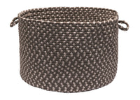 This braided storage basket showcases an intricate blend of rich, earthy tones and creates a beautiful storage solution for a living room or even an outdoor space.