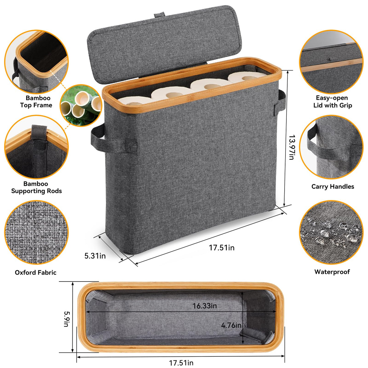 Q: What material is the toilet paper storage basket made from?A: The basket features a nicely finished bamboo frame combined with waterproof Oxford fabric, ensuring both durability and style.