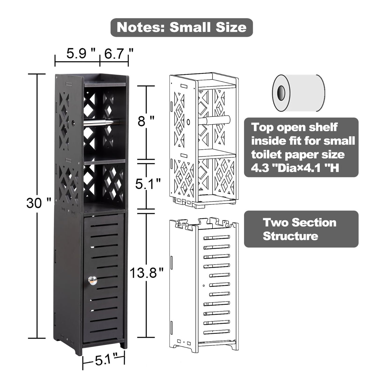Q: What are the dimensions of the H HUIYKALY Toilet Paper Storage Cabinet?A: The H HUIYKALY Toilet Paper Storage Cabinet measures 5.9" in width, 6.7" in depth, and 30" in height, making it an ideal choice for small spaces.
