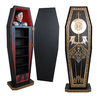From the enjoyable whimsical treasures collection we present the vampire coffin cabinet. this life size coffin is an imaginary representation of a vampire resting in his coffin, featuring a black finish with silver and gold accents. while fun and exciting it also a practical and useful cabinet, great for storing cd's, dvd's or books. this item will add playfulness and unique style to your design space.