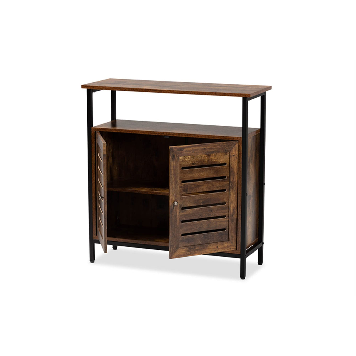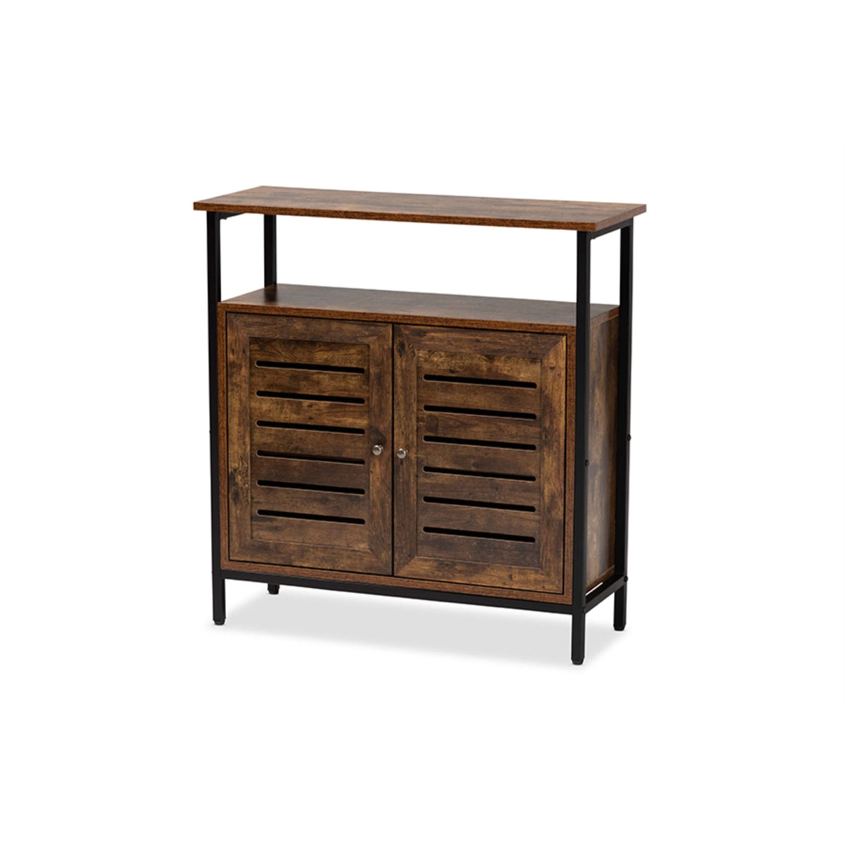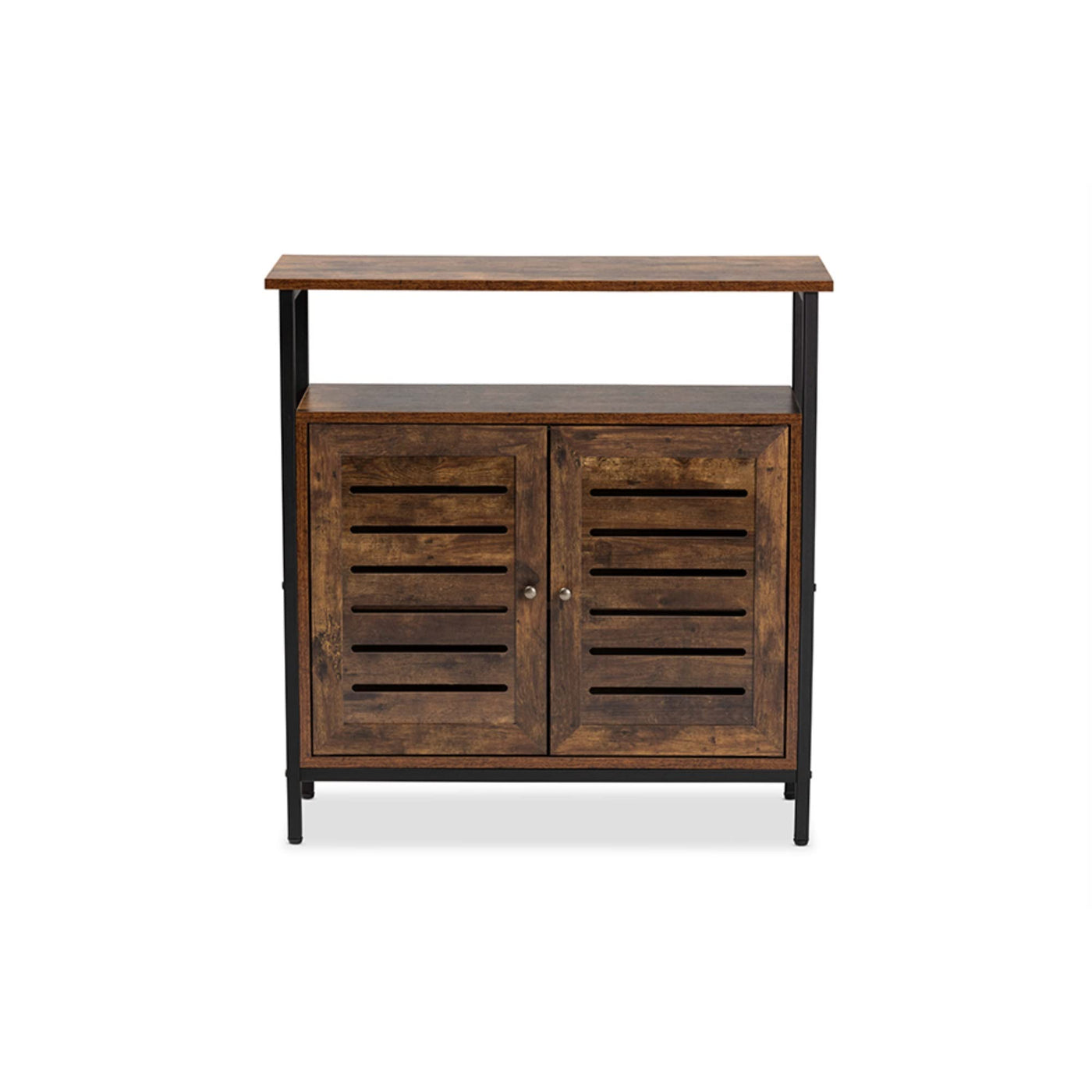 - Finish: Brown - Slatted wood doors - Constructed from engineered wood - Two (2) open shelves and two (2) enclosed shelves behind the doors - Round door knobs - Non-marking feet - Assembly required.
