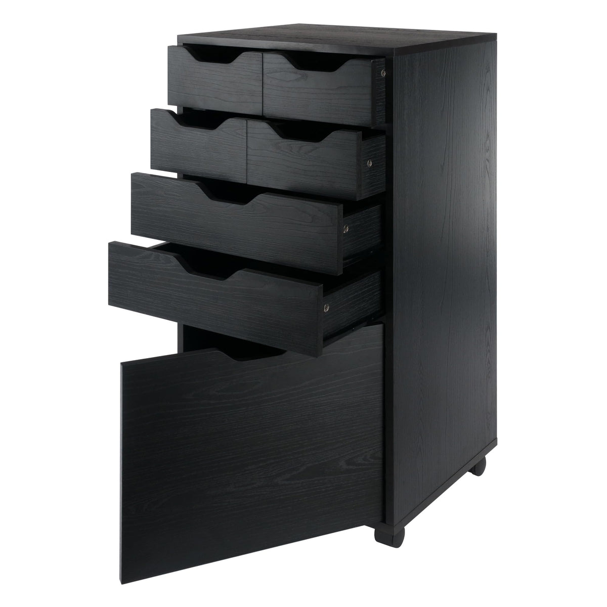 Winsome Wood adds to its Halifax collection with this tall, multi-storage mobile cabinet that is a distinctly versatile piece for a variety of organizational needs. A clean, simple design that will help eliminate the appearance of clutter with convenient cut-out handles that allow for easy-open access. The vertical design allows for minimal floor space to be taken up, while still proving plenty of storage. Ideal for a bedroom, craft room, dorm or even kitchen. It is the perfect organizer for your knitting, sewing, or craft supplies. Or expand your storage for jewelry and styling accessories. Rejuvenate your home-office or den as this unit is well-suited for documents and plenty of space for keeping charging cables and office accessories neat and organized. With 2 fixed, easy-glide, center drawers at 16.06”W x 11.73”D x 2.56”H, and a lower cabinet compartment at 17.95”W x 14.76”D x 13.70”H, making it functional for just about any room of your home. It boasts 4 removable storage bins at 7.95”W x 14.29”, at over 3”H, that function as drawers when inserted. Easily remove one or all to create an open shelf space, or to organize the contents in a different room. Sitting on four wheels, two of which lock, so you can move with ease or keep securely in place. An easy to clean, sturdy composite wood construction in a striking, clean black finish that is certain to blend with any decor. Combine this unit with other cabinets from the Winsome's Halifax collection to create infinite storage options (each sold separately). Ships in one box with the hardware necessary for assembly. Replacement part request can be submitted directly to the manufacturer within 60 days from date of purchase. Overall dimensions: 19.21"W x 15.98"D x 35.39"H Small drawer/storage bin inside dimensions - upper drawers: 7.95"W x 14.29"D x 3.86"H - lower drawers: 7.95"W x 14.29"D x 3.19"H Regular drawer inside dimensions: 16.06"W x 11.73"D x 2.56"H Lower cabinet dimensions: 17.95" W x 14.76"D x 13.70"H Static weight capacity: -Top: 35lbs. -Small drawer/storage bin: 5lbs. each -Regular drawer: 12lbs. each -Compartment: 25lbs. Ships in 1 box Assembly required