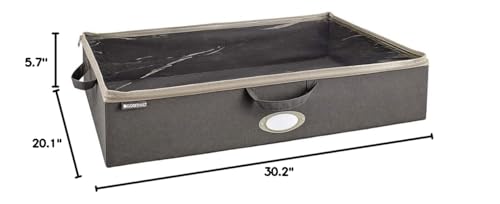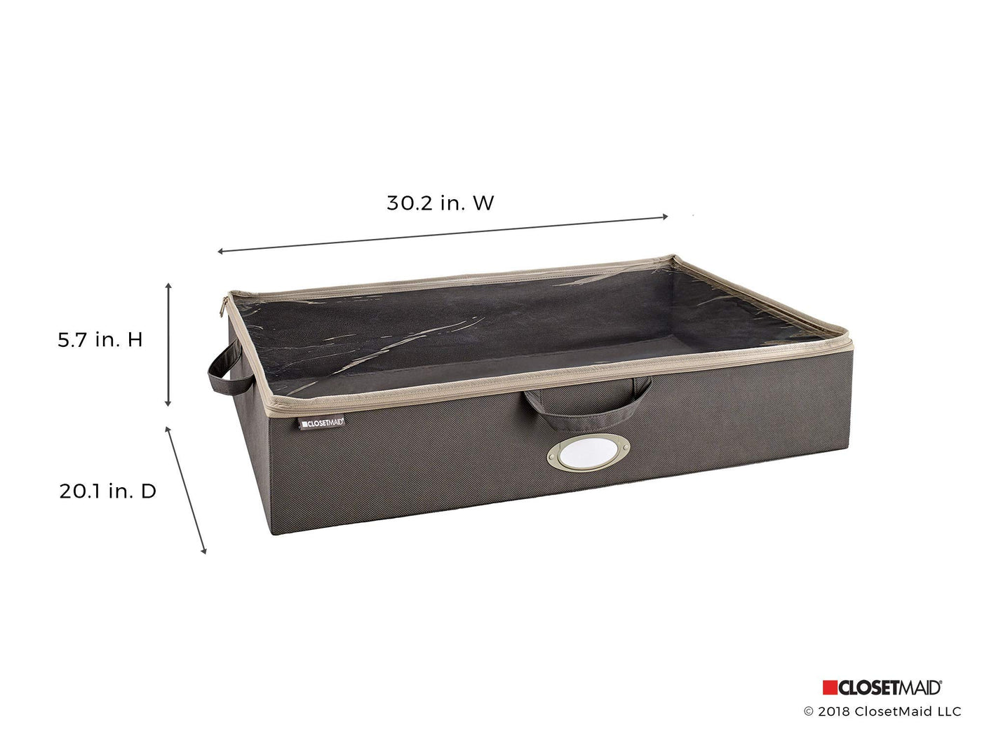 Q: What are the dimensions of the ClosetMaid Under-Bed Fabric Storage Bag?A: The ClosetMaid Under-Bed Fabric Storage Bag measures 5.7 inches high, 30.2 inches wide, and 20.1 inches deep, making it an ideal size for under-bed storage.