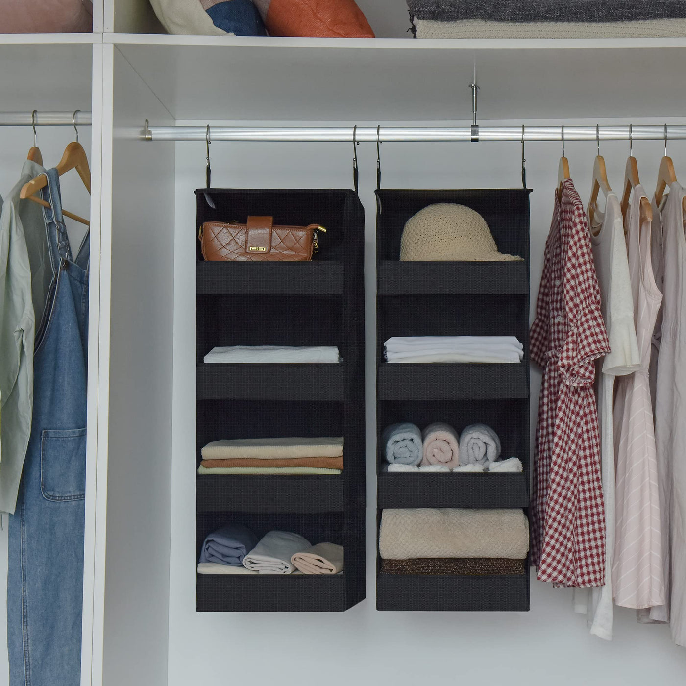 Granny Says 4-Shelf Hanging Organizer, Closet Hanging Shelves, Space Saver For Closet Storage, Black, 2-Pack 4-Shelf Organizers Work Great In Closet, Shelves And Wardrobe For Storing Towels, Accessories, Jewelries, Diapers, Baby Wipes, Etc. Each Shelf Of The Hanging Storage Organizer Has A Removable Board To Enhance The Load Capacity. The Little Strip Design In The Front Of Each Shelf Prevents Items From Slipping Off Accidentally, Especially Some Small Items. Well-Made Of Lightweight, Durable And Washable Polyester Fabric, No Assembly Required. Black Is Suitable For Both Children And Adults, Easy To Match With A Variety Of Storage Space. The Fabric Hanging Closet Organizer Can Be Collapse Flat For Space-Saving When Not In Use Or Take It To Travel.