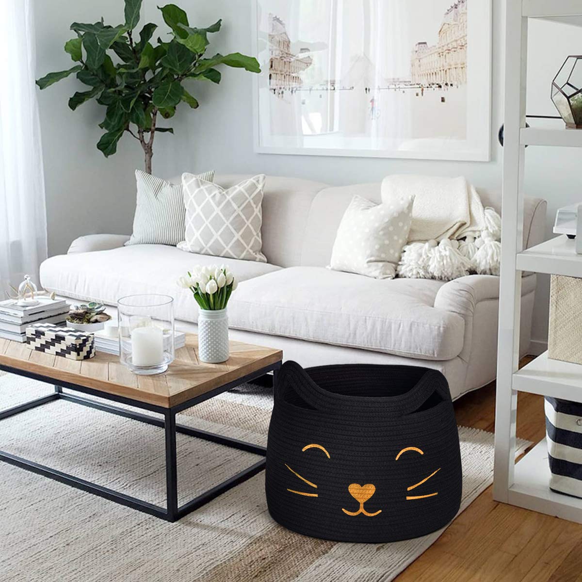 Specifications: Material: Cotton Rope Dimensions: 15.7' Lx11.8' H Color: Black With Golden Cat Face Handles: Cat Ear Handles Application Scenarios: Large Storage Basket: To Organize Towels, Blankets, Clothes, Toys, And Other Big Size Things In The Living Room, Bedroom, Or Using As A Laundry Basket In The Laundry Room. Pet Basket: Can Be Used To Storage Your Pet Food, Toys. Or You Can Put A Cushion In It To Let Your Small Pets Sleep In, Which Will Be Warm Home For Your Pets. Good Customer Service Our Rope Baskets Are Made Of Cotton Rope, Which Is Cheap, Practical And Can Meet Your Different Needs. If You Have Any Questions About Our Products, Please Feel To Contact Us, We Will Certainly Reply To You As Soon As Possible!