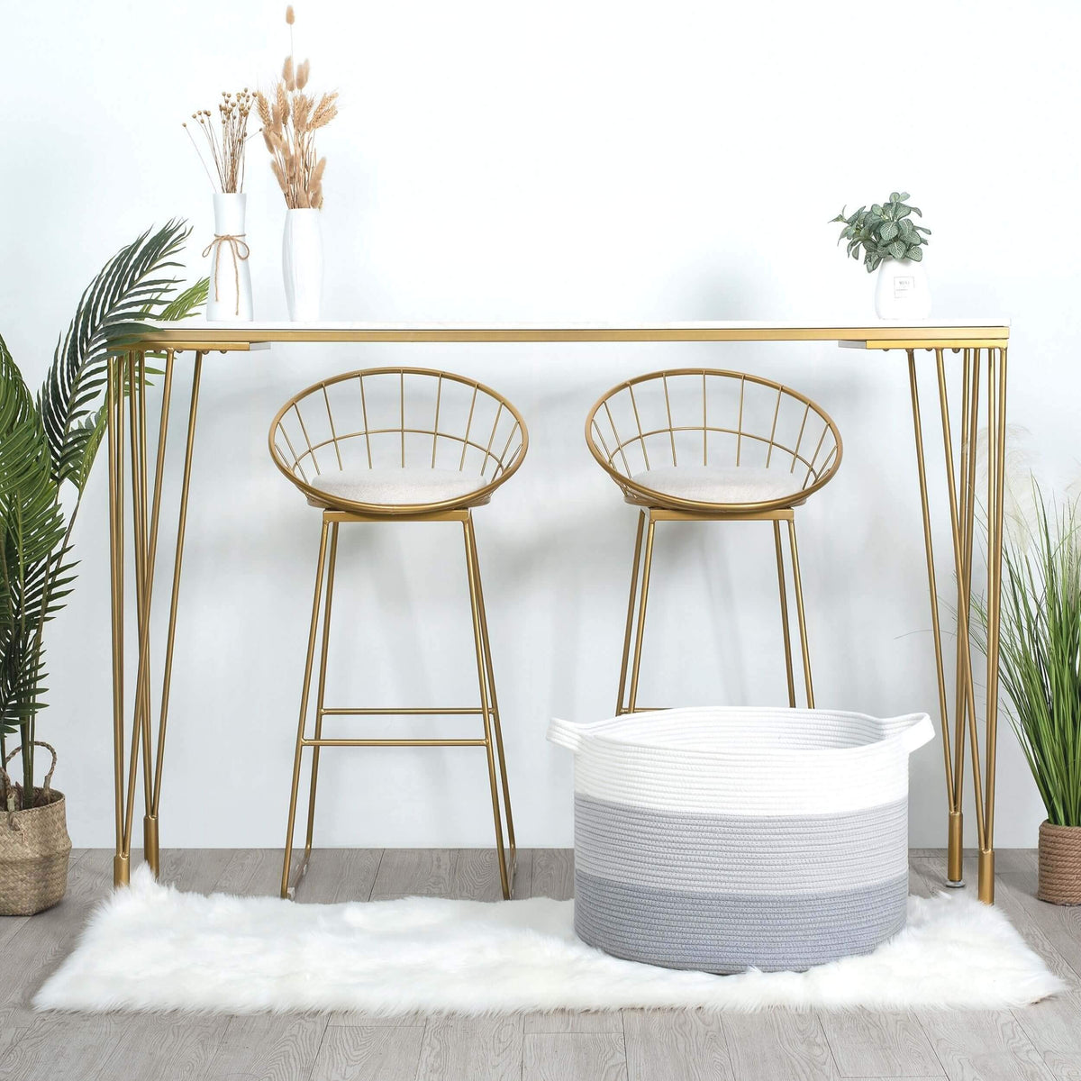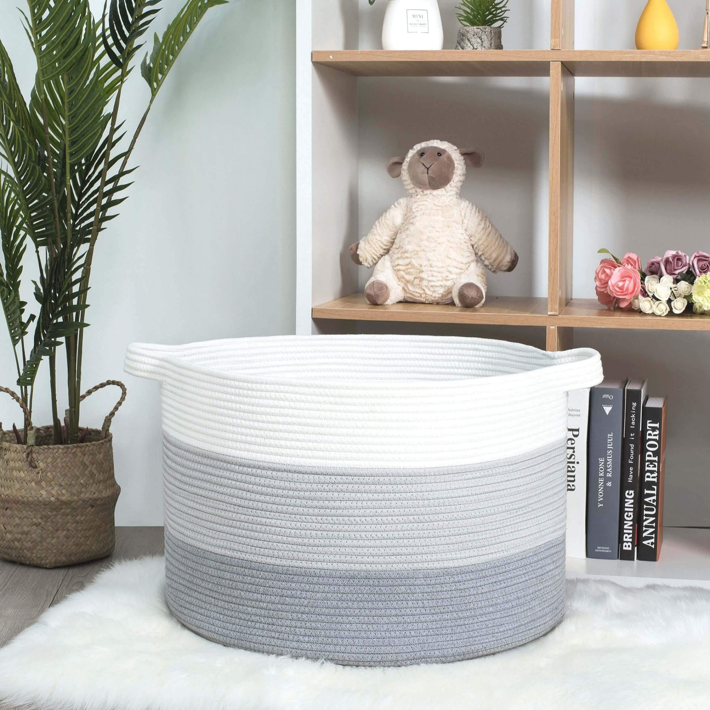 Our 22” (Diameter) x 14” (Height) Jumbo Decorative Woven Cotton Rope Storage Baskets are a stylish and practical way to organize any room in your home. A) Super Extra Large Jumbo Size with Countless Use Possibilities - These baskets are big enough to store bulky items like extra blankets, laundry, toys, & more while offering plenty of space to organize smaller miscellaneous items to help keep your home neat and tidy! In addition, their sleek, sophisticated shape and neutral colors will complement any decor and any room. B) Handmade from Premium Cotton Ropes - Free of sharp edges, our storage baskets are great to use around the house. C) Durable & Built to Last for Years - Made with high-quality materials, our baskets are designed and constructed to last for years. The premium cotton ropes are soft and luxurious, yet sturdy enough to keep its shape and stand up on its own. D) Portable & Collapsible - To ensure durability, our baskets have 10-15 mm of reinforced stitching in each handle, which is well above the average of 3-4mm. The generously-sized handles allow for convenient and comfortable carrying of heavy loads around the house. Should your basket get dirty, simply wipe clean or hand wash and air dry. E) Perfect Gift Idea - Great for birthdays, weddings, housewarmings, or any other gift-giving occasion! F) Important Note - Our baskets come in folded due to their huge size, which may result in some creases. Follow the easy instructions included with the product packaging to regain your basket to its original shape within a day or two with minimum effort.
