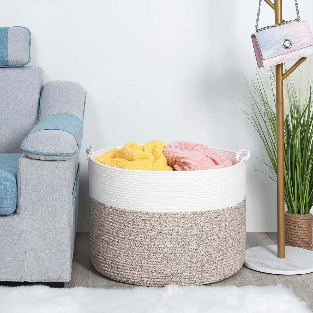 Our 22” (Diameter) x 16” (Height) Jumbo Decorative Woven Cotton Rope Storage Baskets are a stylish and practical way to organize any room in your home. A) Super Extra Large Jumbo Size with Countless Use Possibilities - These baskets are big enough to store bulky items like extra blankets, laundry, toys, & more while offering plenty of space to organize smaller miscellaneous items to help keep your home neat and tidy! In addition, their sleek, sophisticated shape and neutral colors will complement any decor and any room. B) Handmade from Premium Cotton Ropes - Free of sharp edges, our storage baskets are great to use around the house. C) Durable & Built to Last for Years - Made with high-quality materials, our baskets are designed and constructed to last for years. The premium cotton ropes are soft and luxurious, yet sturdy enough to keep its shape and stand up on its own. D) Portable & Collapsible - To ensure durability, our baskets have 10-15 mm of reinforced stitching in each handle, which is well above the average of 3-4mm. The generously-sized elegant knot handles allow for convenient and comfortable carrying of heavy loads around the house. Should your basket get dirty, simply wipe clean or hand wash and air dry. E) Perfect Gift Idea - Great for birthdays, weddings, housewarmings, or any other gift-giving occasion! F) Important Note - Our baskets come in folded due to their huge size, which may result in some creases. Follow the easy instructions included with the product packaging to regain your basket to its original shape within a day or two with minimum effort.