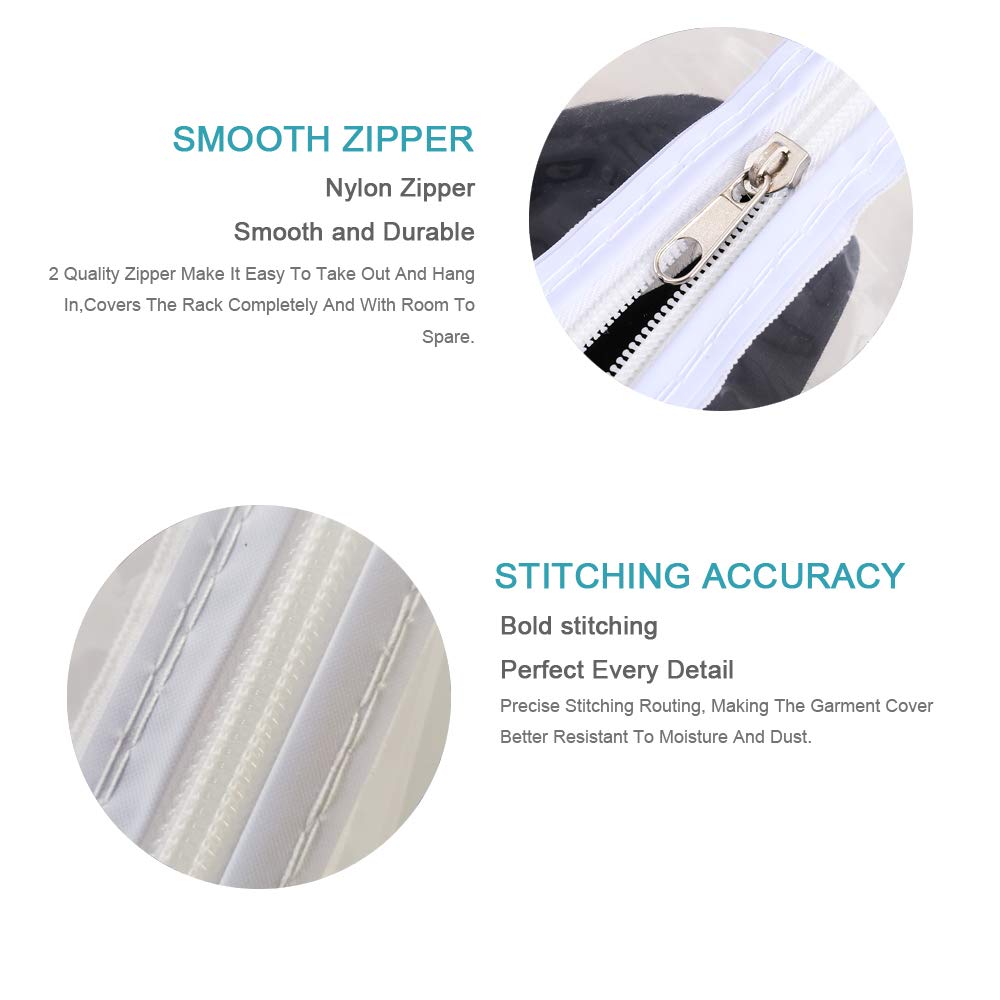 Q: How does the zipper feature work on this garment cover?A: The garment cover features two quality zippers that allow for easy access to your clothes without having to remove the cover. This ensures that your garments stay protected from dust while still being easily accessible.
