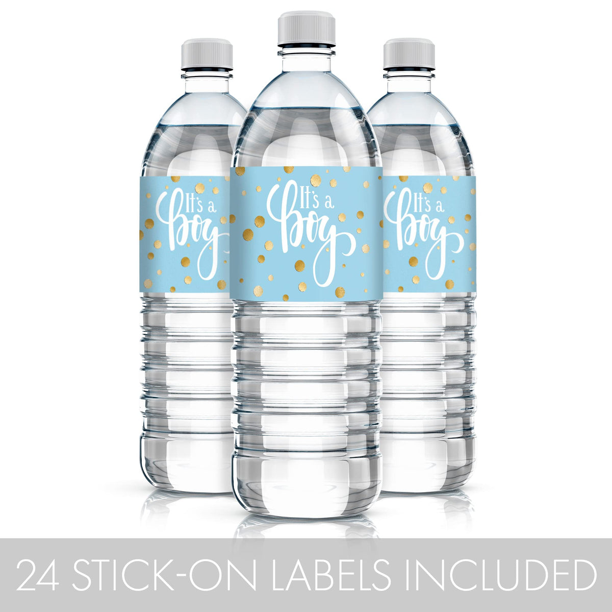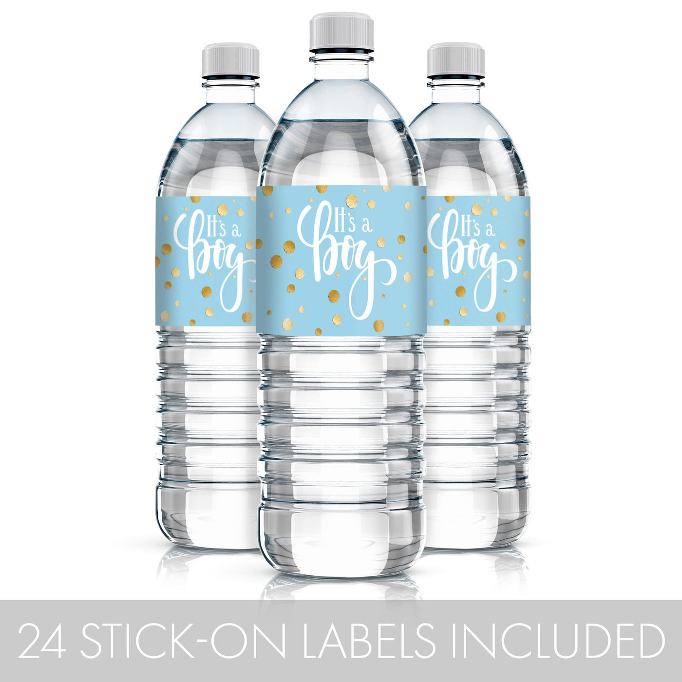 Blue And Gold Baby Shower Water Bottle Labels: 24 Waterproof Stickers. Water Bottles Not Included. Stick Around Standard And Mini Size Water Bottles. People Use Decorated Water Bottles For: Table Decorations Or Favors For Guests. Made In The Usa By Distinctivs. Printed Design - Not Glitter, Not Foil.