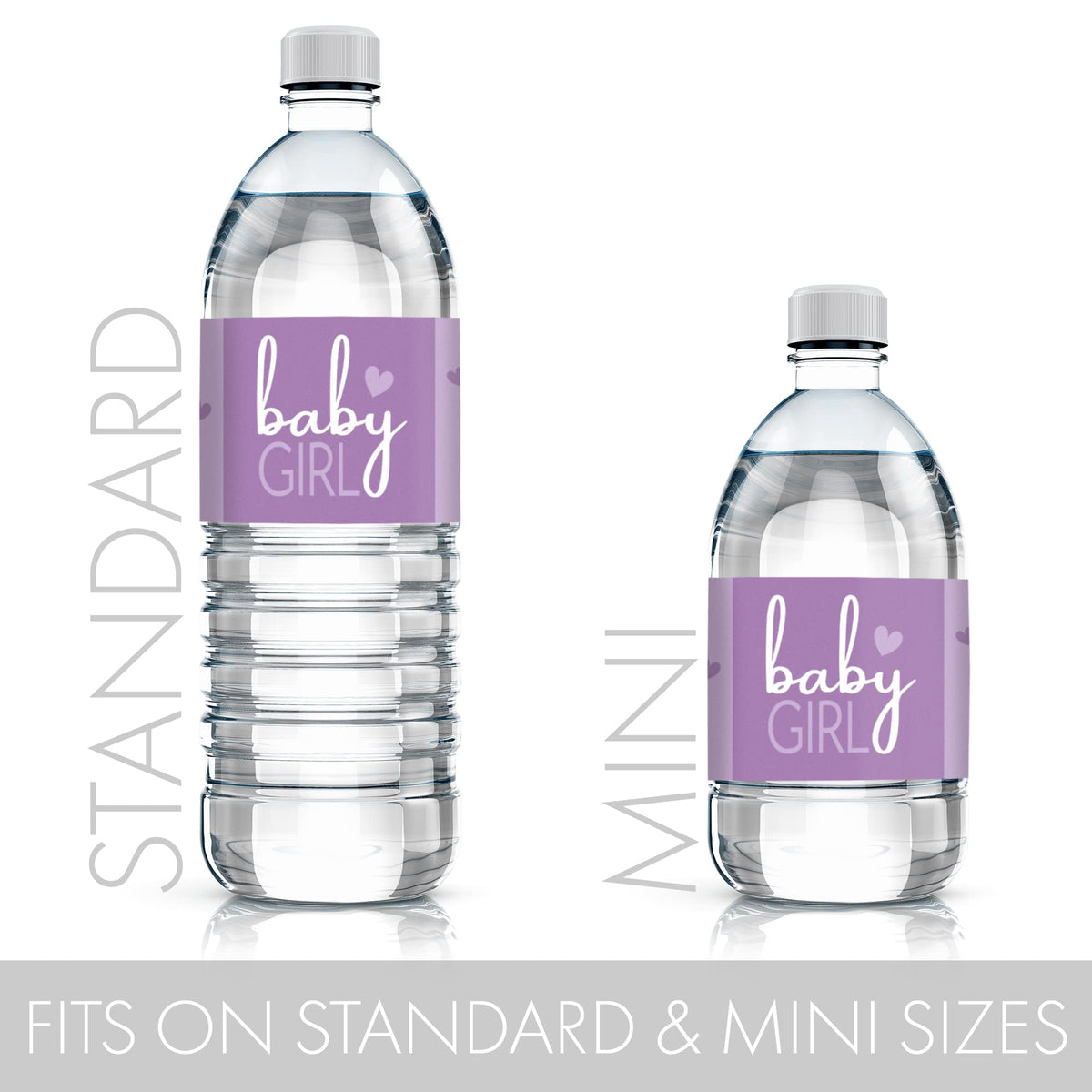 Q: What are the dimensions of the Purple Baby Shower Water Bottle Labels?A: The labels measure 8 inches by 2 inches, making them suitable for both standard and mini water bottles.