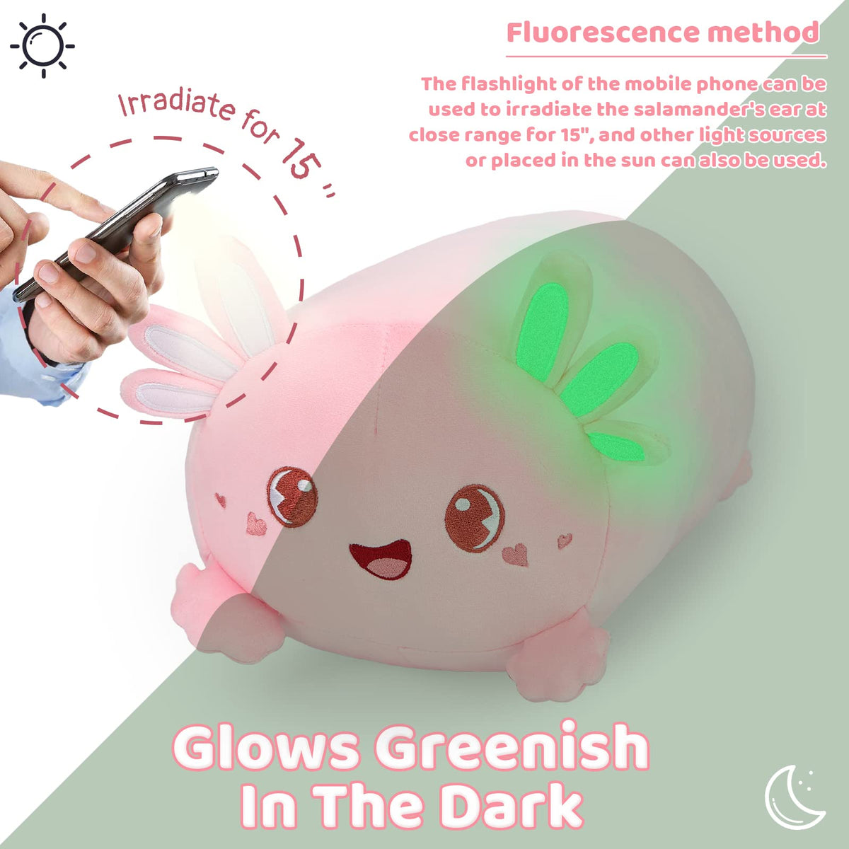 Q: How does the luminous feature work on the axolotl plush pillow?A: The axolotl plush pillow features luminous fabric in its ears that can glow slightly green in the dark after being exposed to sunlight during the day.