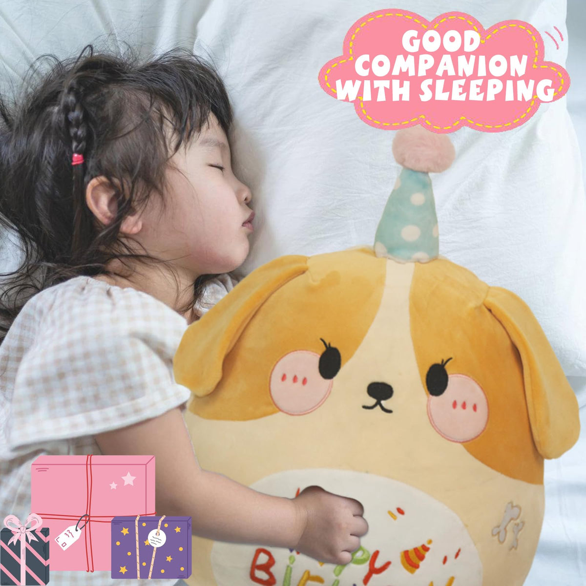 Q: What makes this plush toy a good gift choice?A: This plush toy is a great gift for kids' birthdays and festivals due to its cute design and versatile use, making it a delightful addition to any child's room.
