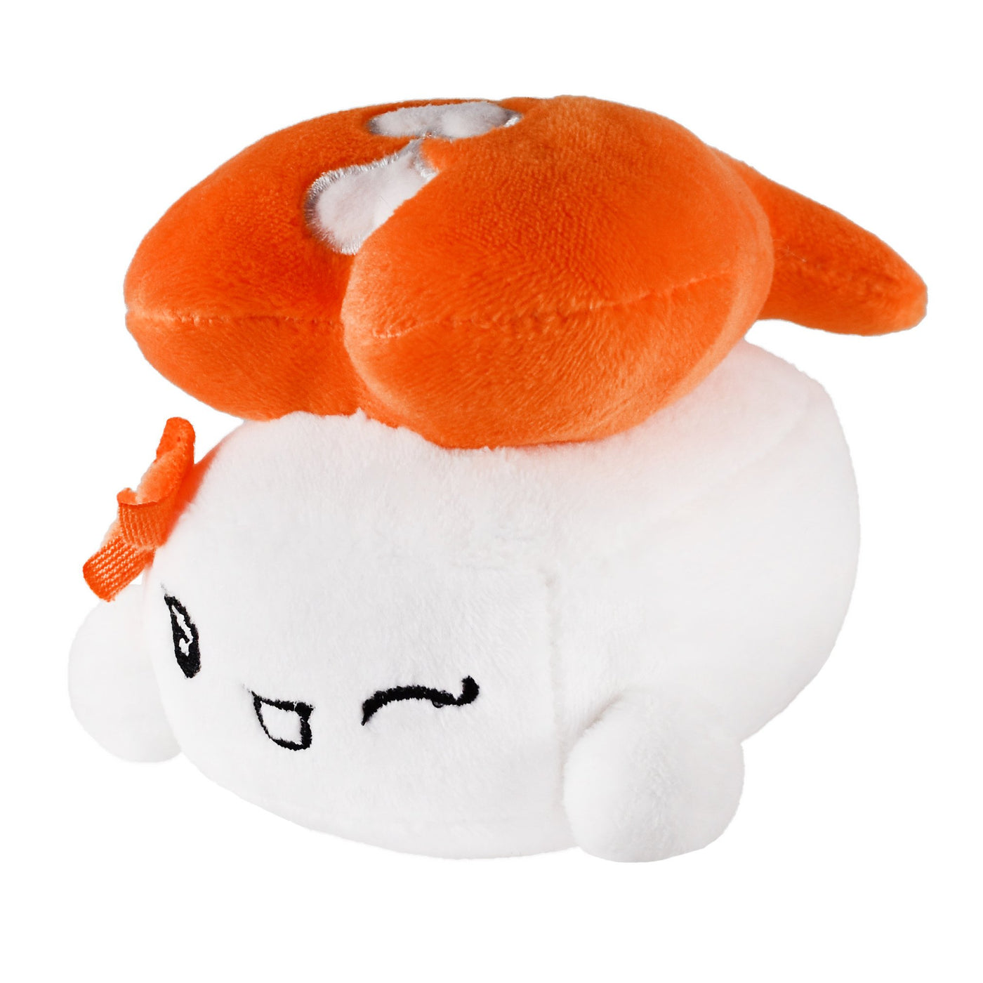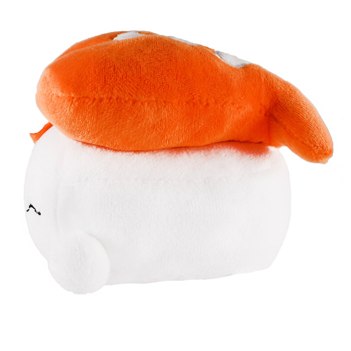 Q: How big is the small shrimp sushi plush?A: The small shrimp sushi plush measures approximately 4 inches in length, 3.5 inches in width, and 3.5 inches in height, making it a perfect size for cuddling, using as a pillow, or keeping as a desk companion.