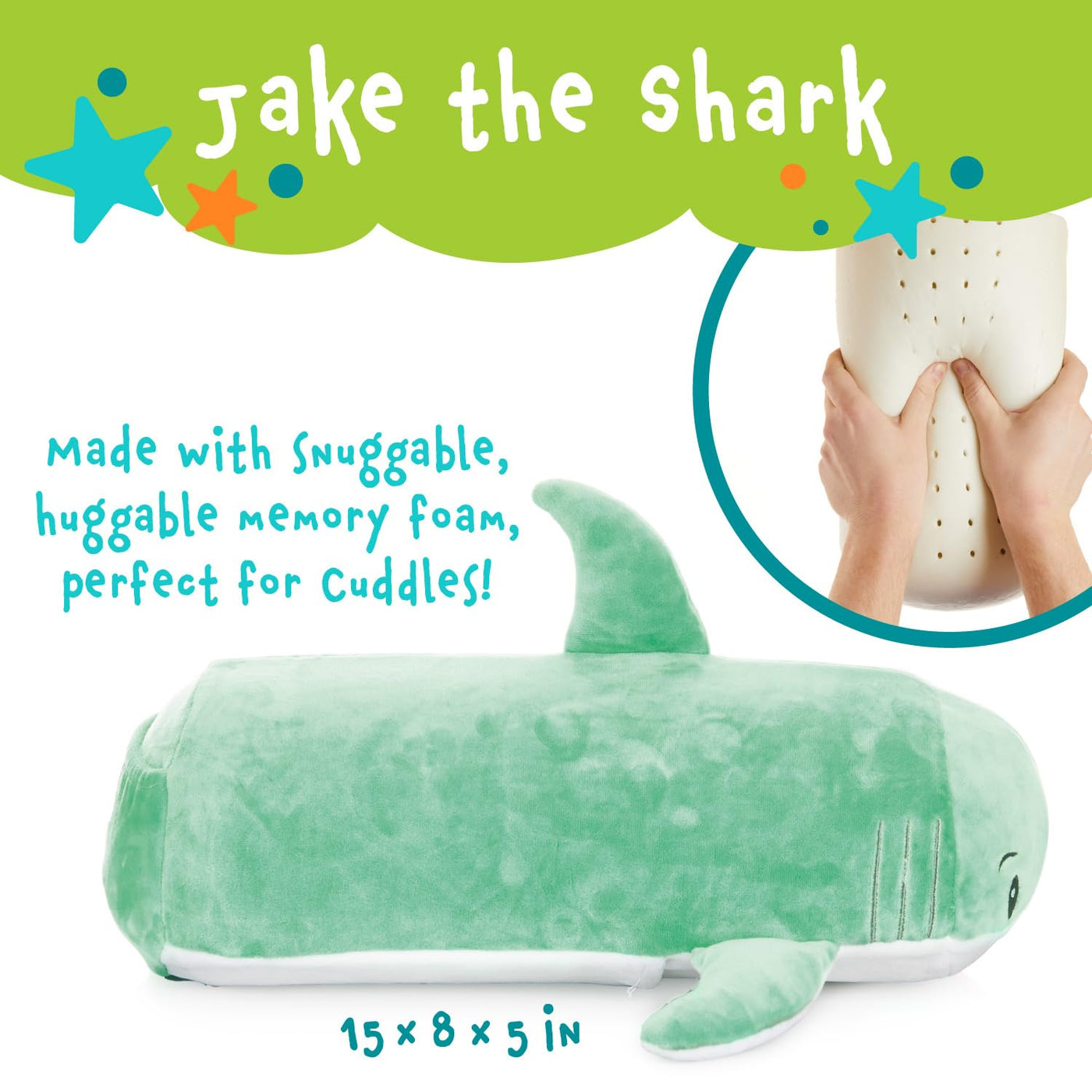 Q: What age group is the MEMORY MATES Jake The Shark Memory Foam Pillow suitable for?A: The MEMORY MATES Jake The Shark Memory Foam Pillow is designed for kids of all ages, making it a perfect companion for boys and girls alike. Its cuddly design and soft materials ensure comfort during naps and playtime.