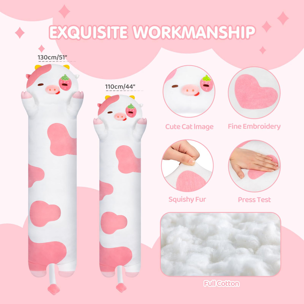 Mewaii Long Cow Plush Kawaii Body Pillow, 53 Cute Strawberry Cow Stuffed Animals Soft Plushies, Big Squishy Pillow Doll Toy G