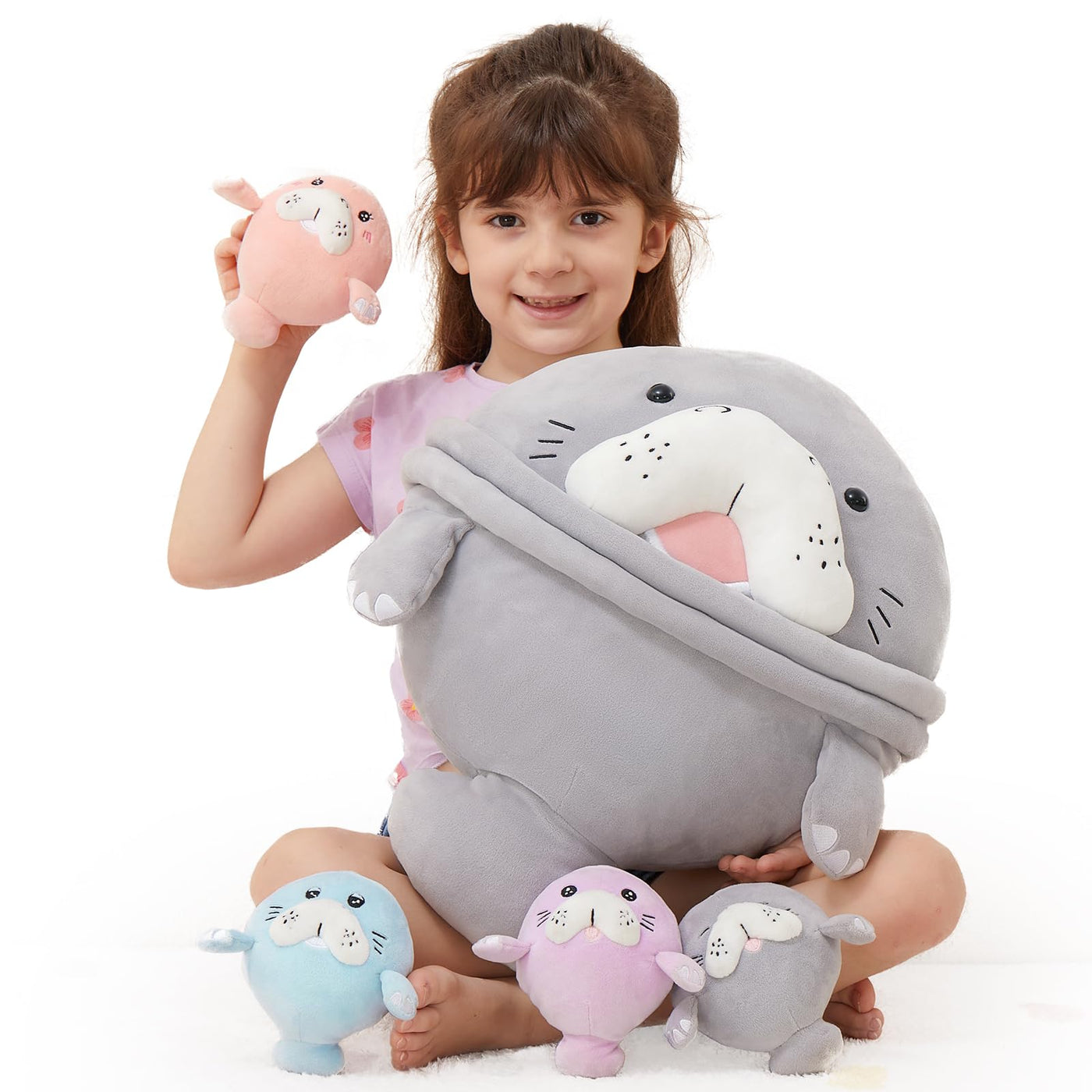 Meet The Morismos Plush Manatee Family:Manatee Are So Cute And Lots Of Ocean Animal Lovers And Kids Love Them. Morismos Delightful Push Manatee Stuffed Animal Toys Set For Kid Measures 19 Inches And Surprised With 4 Colorful Small Baby Manatees Inside Her Belly--1 Gray Manatee, 1 Pink Manatee, 1 Blue Manatee, And 1 Purple Manatee. Perfect For Car Rides Or Snuggle Time On The Couch, The Morismos Manatee Stuffed Animal Is Sure To Become A Beloved Companion.Educational And Fun Manatee Toys: Established In 2016, We Are Dedicated To Crafting High-Quality Stuffed Animals For All Ages. More Than Just Toys, Morismos Plush Animals Help Children Learn About Love, Care, And Responsibility. The Morismos Plush Manatee Family Serves As A Great Educational Tool That Encourages Children To Explore Their Creativity Through Imaginative Play. Ready For Imaginative Play And Cuddles? Your Kids Will Love Creating Stories With This Beautiful Plush Set.Soft And Cuddly Manatee Hugging Plush Toys Set: Made From High-Quality Plush Fabric And Filled With Fluffy Pp Cotton, This Realistic Manatee Plush Provides A Super Soft And Comforting Experience. It Also Doubles As A Cozy Stuffed Manatee Pillow For Those Moments When Your Little Ones Need To Curl Up And Relax. Firm Lock-Washer Eyes Ensure Safety During Playtime. 5 Packs Manatee Stuffed Animal Plush Set Have Passed Cpc And Ce. Parents Can Rest Assured That These Manatee Plush Toys Are Safe For Their Little Ones, Making Them Ideal Plush Sea Cow Toys For Kids Of All Ages.Perfect Gifts For Any Occasion: Searching For Manatee Gifts Or Christmas Manatee Toys? The Morismos Plush Sea Cow Makes A Wonderful Present For Birthdays, Holidays, Or Just Because! Its Lifelike Features And Adorable Design Make It A Great Choice For Ocean Lovers And Sea Life Animal Lovers. Mommy Manatee With 4 Babies Ideal For Children And Adults Alike, This Snuggle Plush Toy Is Destined To Bring Joy To Any Home.