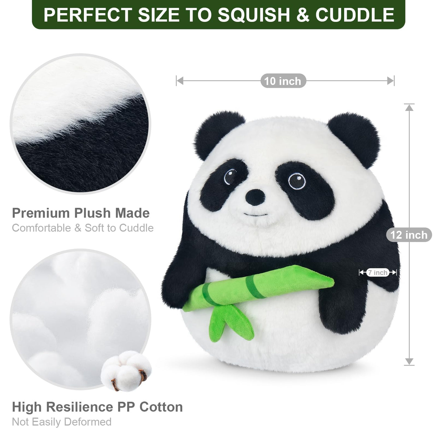 Q: What size is the SuzziPals Panda Stuffed Animal?A: The panda plush pillow measures 13 inches, making it a perfect size for cuddling, hugging, or using as a decorative accent in your home.