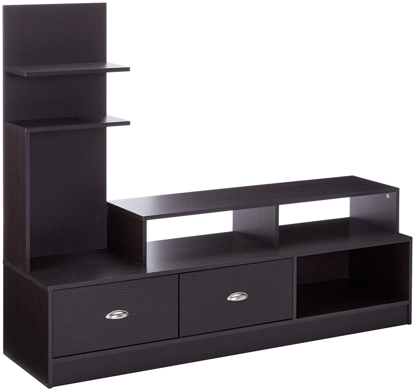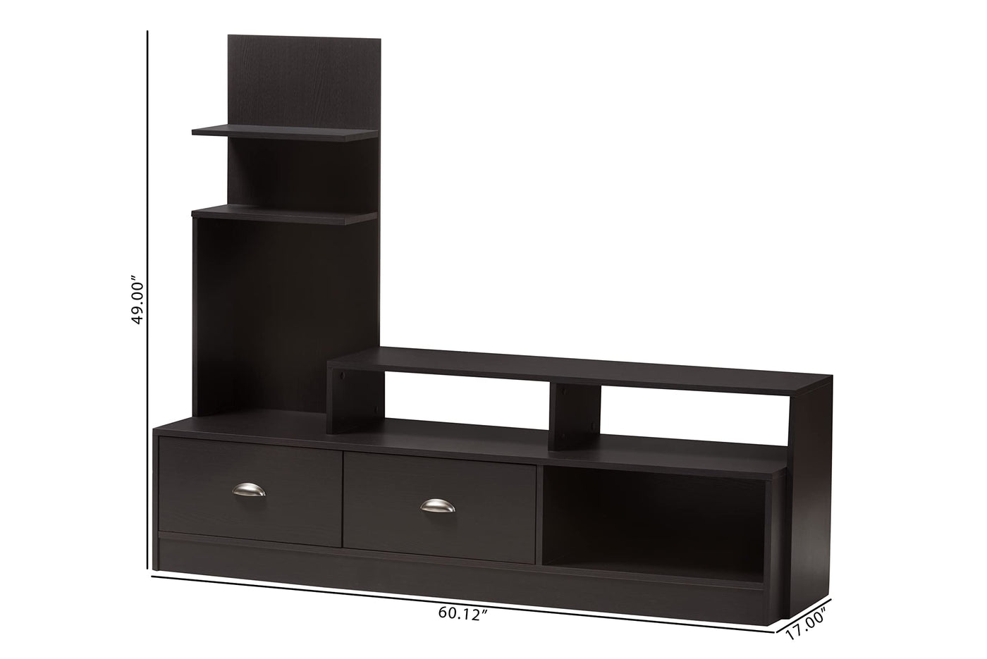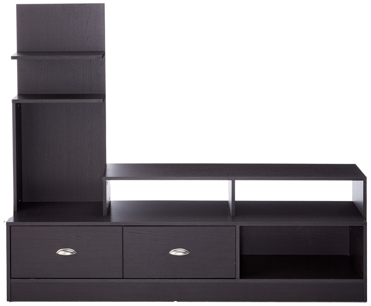 With your electronics being a variety of different sizes, the Armstrong Designer TV Stand steps up to the plate to deliver a bevy of differently-sized shelves to hold your eclectic collection. The Armstrong Contemporary TV Stand is finished with dark brown(Espresso) faux wood grain paper veneer. A built-in vertical side console includes two short shelves perfect for photo frames, books, or DVDs. Two drawers on the bottom of the unit include silver drawer pulls. Maintenance is simple: just wipe the unit's surfaces with a dry cloth. Assembly is required. 49 Inch high x 60.12 Inch wide x 17 Inch long. Features: - Contemporary TV stand - Engineered wood frame - Dark brown faux wood grain paper veneer - Two drawers with silvertone metal hardware - Built-in vertical shelf tower - Assembly required - Wipe clean with a dry cloth.
