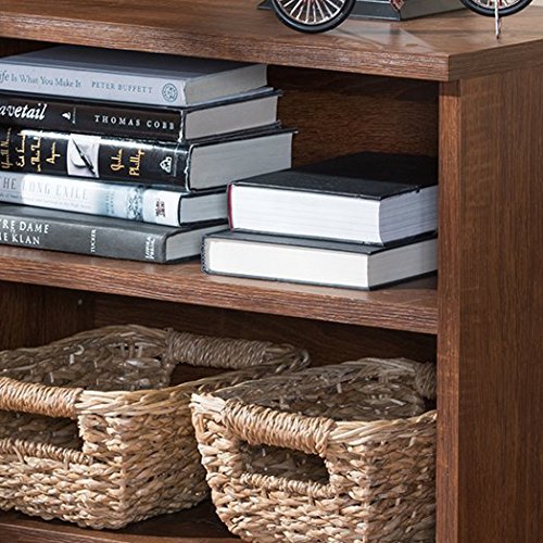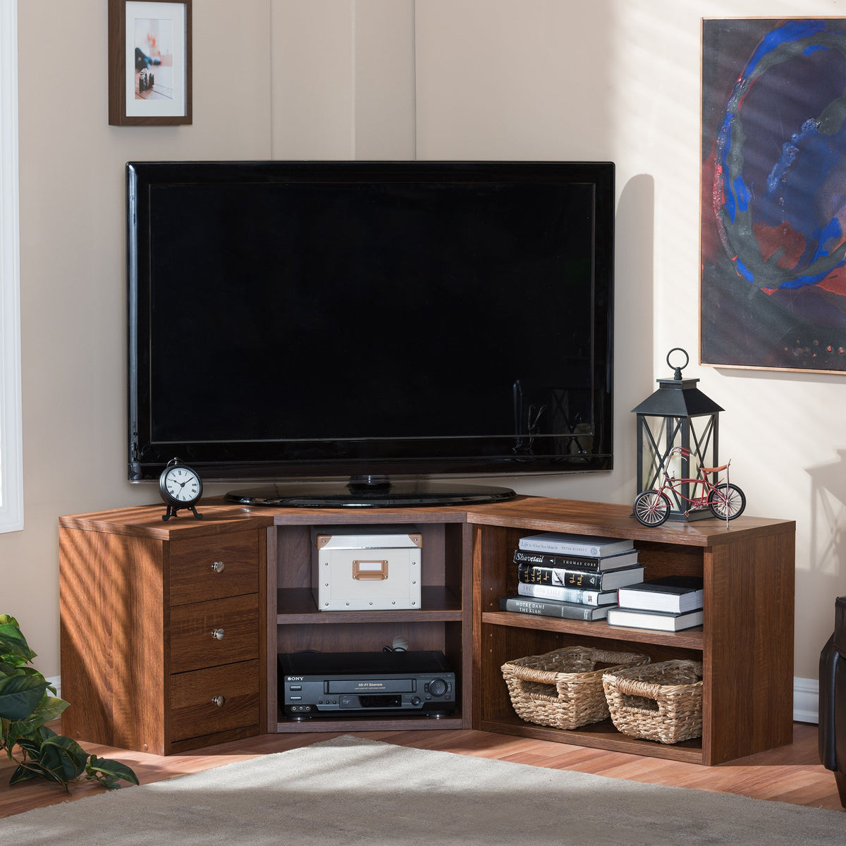 Conquer your underutilized or vacant corner space with our commodore TV stand. Sure, the top provides the perfect perch for your flat-panel TV, but this piece is designed to go beyond the typical TV stand by offering plenty of space for displaying magazines, knick-knacks and home-living accessories. A three-drawer chest with side shelf opens up the storage possibilities. Cables are easily managed via pre-drilled holes at shelf level for videogame consoles and other electronic players. The Sonoma oak finish looks fabulous. Overall dimensions: 17.75 Inches high x 55.25inches Wide x 33.2inches Deep Left side shelf: 17.75 Inches high x 23.5 Inches wide x 12.2 Inches deep right side cabinet: 17.7 5 inches high x 12 inches wide x 12.25 Inches deep middle shelf: 17.75 Inches high x 32.75 Inches wide x 21.1inches Deep.