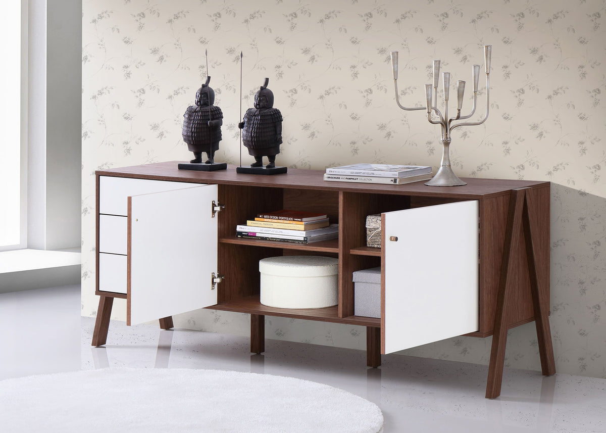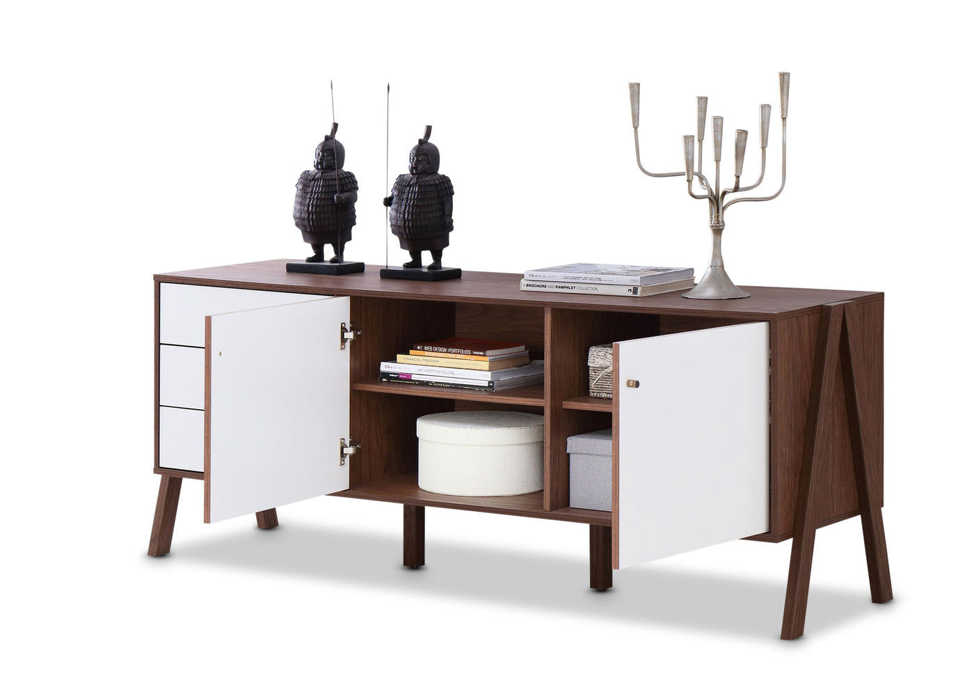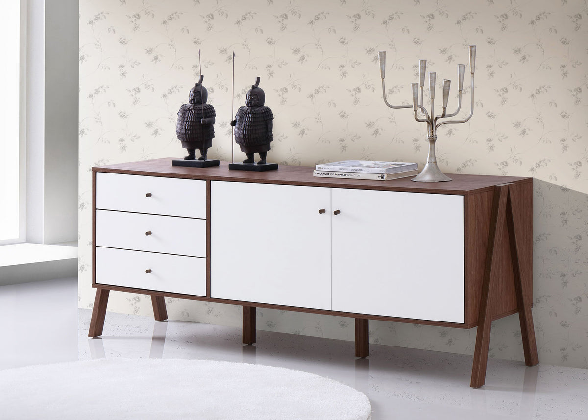 Highlight the handsomely modern feel of your space with the superior storage and Scandinavian style of the Harlow Sideboard Cabinet. Made from sustainably sourced engineered wood and sturdy rubber wood legs with lasting quality, the sideboard is finished in white and walnut two tone PU veneer. The two doors open to reveal internal shelving that's ideal for storage with three additional drawers on the left. Angled legs complement the white-and-walnut contrast tones for a design steeped in retro, Scandinavian style. Streamlined style-lines for a contemporary design that works well with a range of interiors, from mid-century to modern and from Scandinavian to Hamptons or urban loft, the Harlow will provide ample storage and style to your entryway or living room for practicality. Made in Malaysia, the Harlow requires assembly.