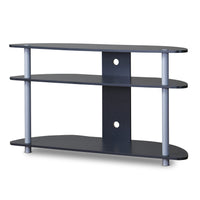 TV and more! with its open design, the orbit TV stand offers a fun way not only to position your television, but to display plenty of decorative and home-living accessories. This stand is more than contemporary; it’s futuristic with its pipe tube and curved-edge shelving. The top offers the perfect perch for your flat-panel TV. Cables are easily managed via pre-drilled holes at shelf level for videogame consoles and other electronic players. Overall: 32.75"h X 38.6"w X 13.5"d, Upper shelf : 6.5"h X 38.6"w X 13.5"d, Buttom shelf : 13.5"h X 38.6"w X 13.5"d.