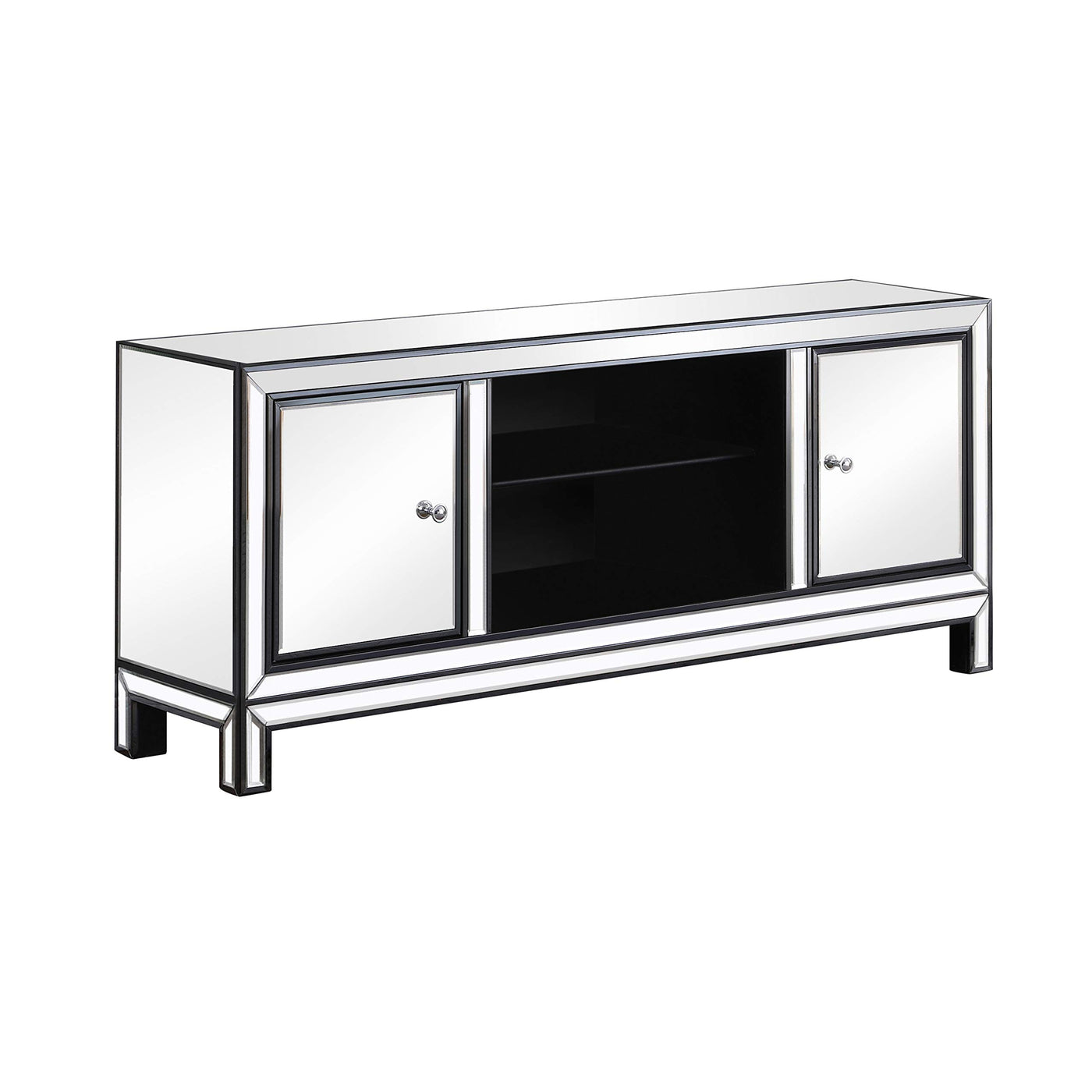 Create a stunning display with this beautiful and modern TV console. With a stunning mirror finish and black trim, this piece makes an instant focal point. Two open shelving units offer a space to store media. Two side cabinets present even more opportunity to store and conceal items. This TV console can support up to a 60-inch TV.