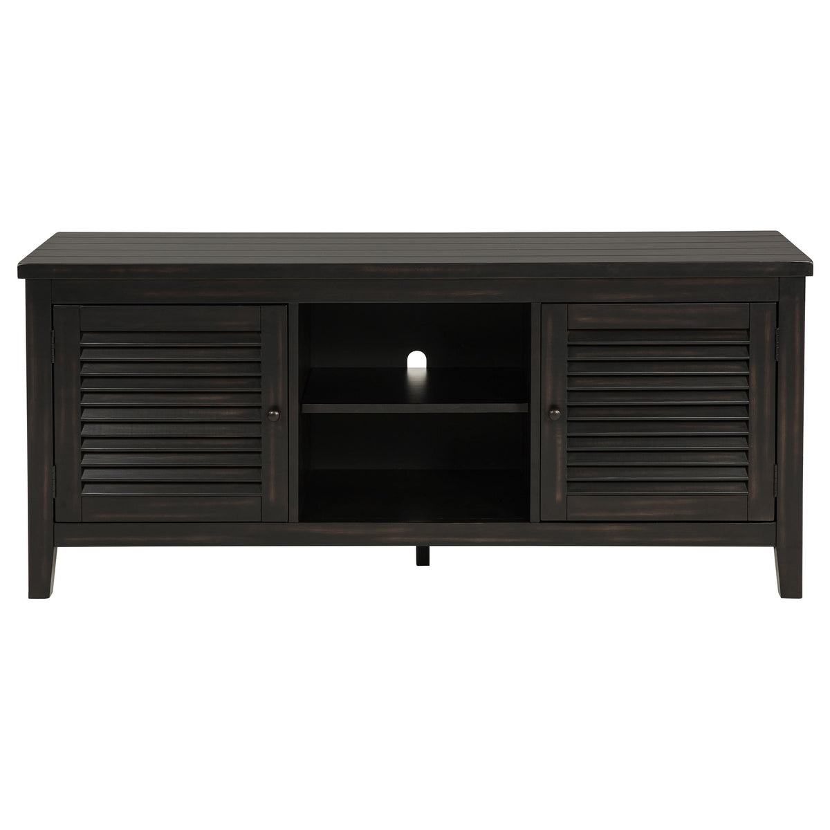 Includes: One (1) TV stand | 60-inch TV stand, suitable for TVs up to 65 inches | Two louvered doors offer concealed storage for media and accessories | Central open shelves with cord management cutouts for easy access and a tidy setup | Planked top adds a rustic, elegant touch to the design