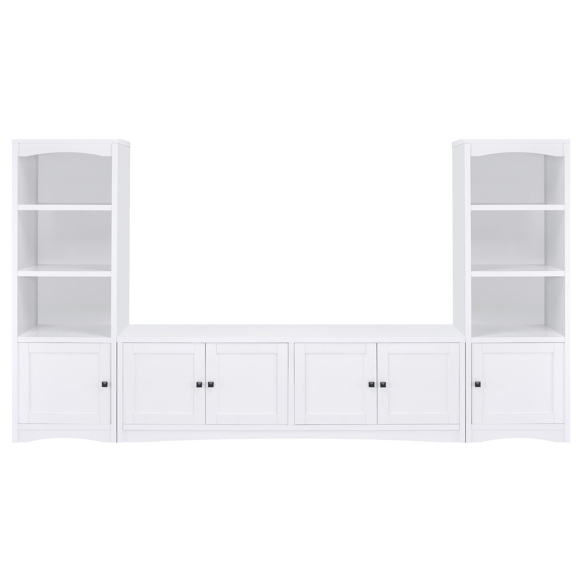 Transform your living space with this beautifully crafted entertainment center, designed to combine style and functionality for your media needs. Anchored by a 78-inch TV stand, this set is perfect for hosting up to an 80-inch television, offering a spacious and organized solution for your home. The TV stand features four doors that open to adjustable shelves, complete with cord management openings, making it easy to keep your media and gaming components neatly arranged. Flanked by two matching media towers, the entertainment center provides additional storage and display options with a mix of open shelving and concealed cabinet space. Finished in a warm, neutral tone, this entertainment center blends seamlessly with any decor, creating an inviting focal point in your living room.