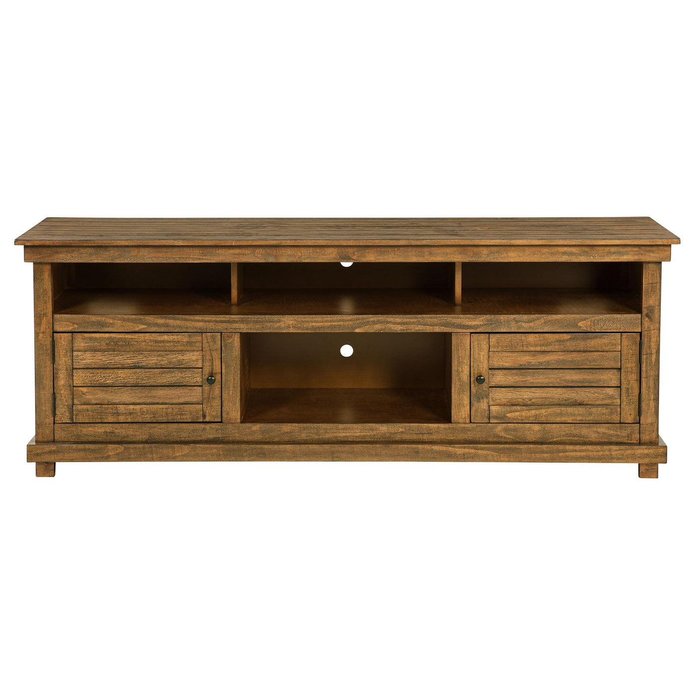 Includes: One (1) TV stand | Roughhewn wood markings add artisan character to a modern farmhouse TV stand | A distressed finish lends casual farmhouse character in your den or living room | Four open shelves provide space for media and gaming peripherals and decor | Two cabinets add hidden storage that's perfect for accessories and media like games and controllers