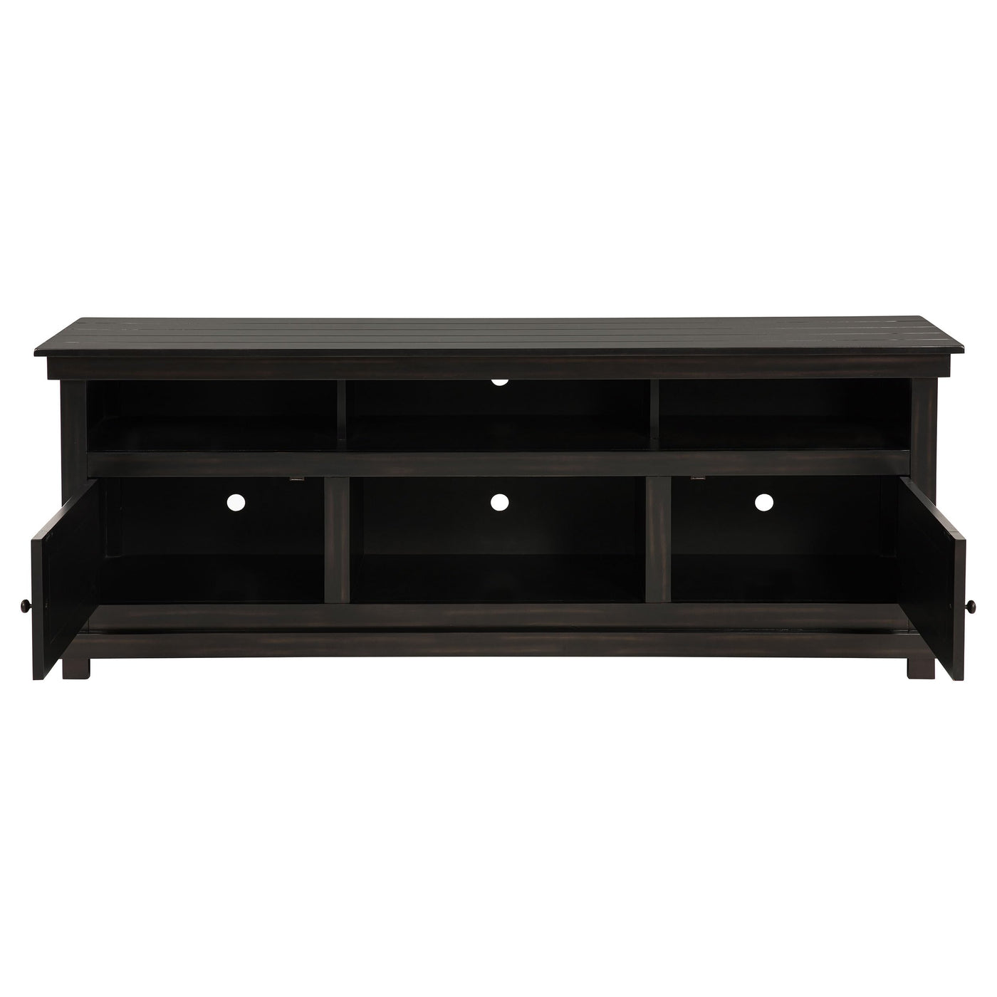 Introduce expansive storage underneath your flat panel television with this modern farmhouse TV stand. It's a wooden design with roughhewn details that offer charming texture and casual allure in your living room or den. Two cabinets offer decorative doors while providing plenty of interior storage that helps to create a tidy look in your living room. Two open shelves create space for media and gaming components mixed with decor that offers a personalized touch. Cord management openings complete the design, making for a streamlined design that accommodates televisions up to 75 inches placed on top or mounted above.