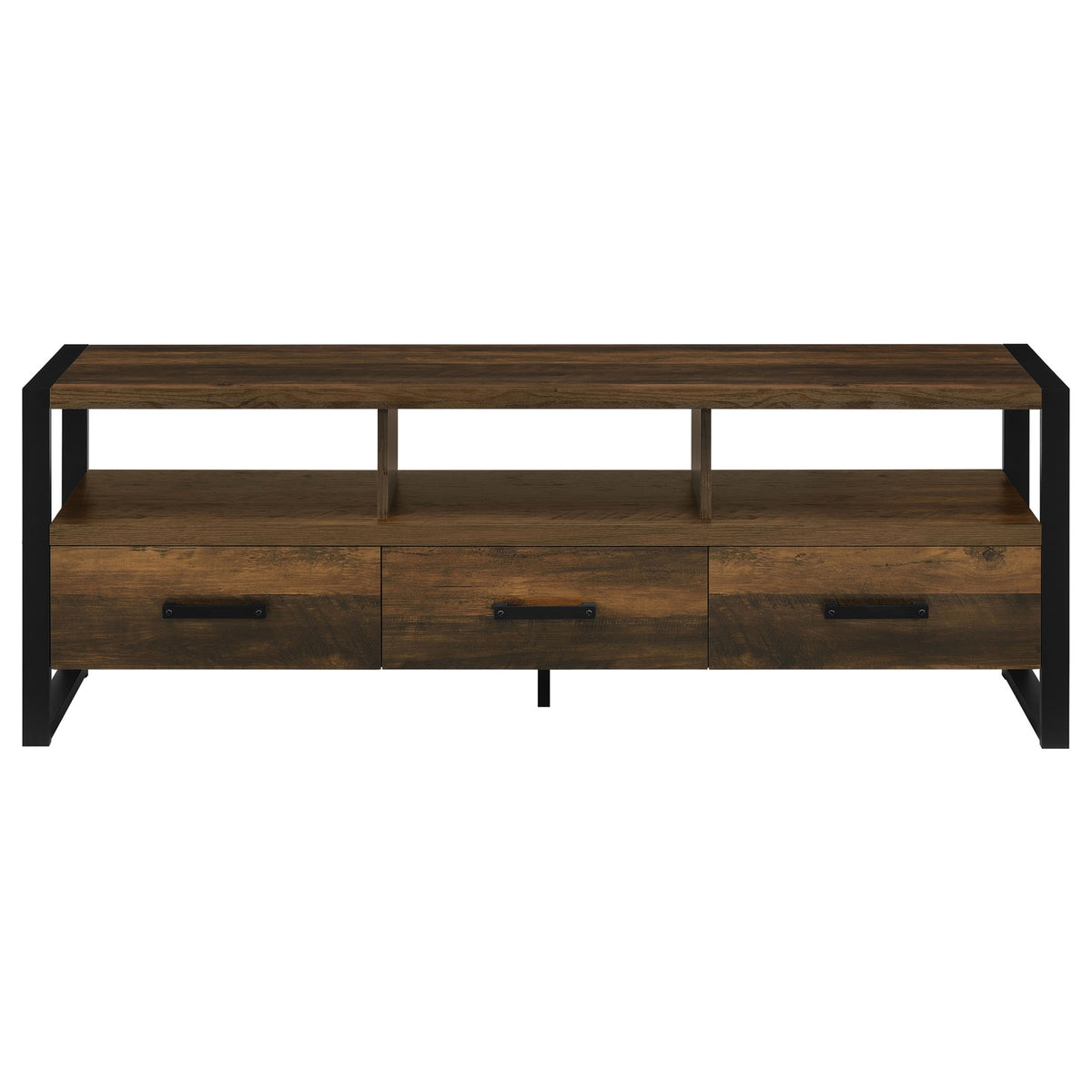 Your casual living space becomes a home for easy entertaining with a TV stand suited to plenty of functions. Dark pine finish MDF creates a sturdy build and alluring appearance in a TV stand that is versatile and earthy. A stacked design is configured perfectly with three open compartments to house electronic components, and three lower drawers feature Euro glides for easy operation. Black metal side braces and matching drawer pulls create a streamlined design. Choose this TV stand for a casual space that transforms into a perfect place for sports or movies.FeaturesDark pine finish MDF creates a sturdy build and alluring appearance in a versatile, earthy TV stand Stacked design with three open compartments to house electronic components and three lower drawers with Euro glides for easy operation Black metal side braces and matching drawer pulls create a streamlined design Ideal for casual living space that transforms into a perfect place for sports or movies Versatile and functional TV stand suited to plenty of functionsDimensions:TV StandAssembled Product: 60 inches wide x 15.5 inches deep x 21.75 inches high Weight Capacity: 200 poundsAt Coaster, we are your premier source for exquisite furniture, offering diverse styles to enhance every aspect of your life. Our passion for excellence drives us to innovate, crafting budget-friendly furniture that complements your lifestyle. Explore our brands for endless design inspiration and make your living experience exceptional with thoughtfully designed, affordable pieces that inspire a life well-lived.