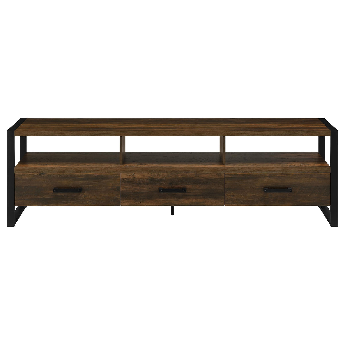 Your casual living space becomes a home for easy entertaining with a TV stand suited to plenty of functions. Dark pine finish MDF creates a sturdy build and alluring appearance in a TV stand that is versatile and earthy. A stacked design is configured perfectly with three open compartments to house electronic components, and three lower drawers feature Euro glides for easy operation. Black metal side braces and matching drawer pulls create a streamlined design. Choose this TV stand for a casual space that transforms into a perfect place for sports or movies.FeaturesDark pine finish MDF creates a sturdy build and alluring appearance in a versatile, earthy TV stand Stacked design with three open compartments to house electronic components and three lower drawers with Euro glides for easy operation Black metal side braces and matching drawer pulls create a streamlined design Ideal for casual living space that transforms into a perfect place for sports or movies TV stand suited to plenty of functions for easy entertainingDimensions:TV StandAssembled Product: 70.75 inches wide x 15.5 inches deep x 21.75 inches high Weight Capacity: 200 poundsAt Coaster, we are your premier source for exquisite furniture, offering diverse styles to enhance every aspect of your life. Our passion for excellence drives us to innovate, crafting budget-friendly furniture that complements your lifestyle. Explore our brands for endless design inspiration and make your living experience exceptional with thoughtfully designed, affordable pieces that inspire a life well-lived.