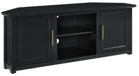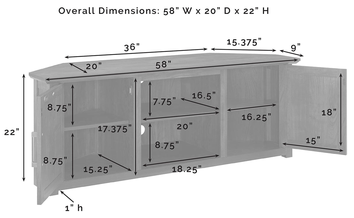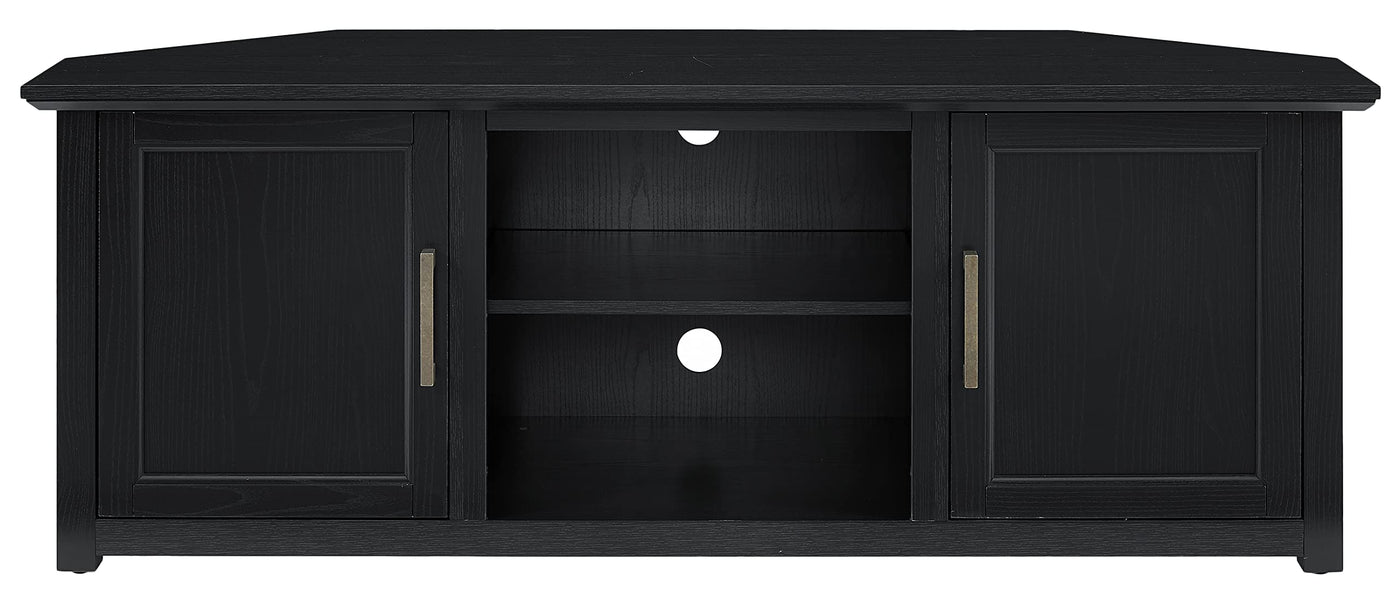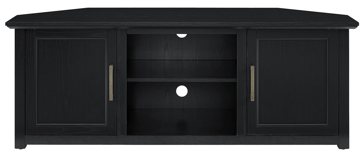 Ideal for smaller living spaces, the Camden 58” Corner TV Stand tucks neatly into any corner. Featuring two cabinets with an adjustable shelf in each, this stand is ready to corral your books, video games, or other media. The open storage in the center offers an adjustable and removable shelf with two pre-cut holes in the back for cable management. Sized to fit most TV’s up to 65 inches, the Camden 58” Low Profile TV Stand exudes rustic style with the look of wood-grain and substantial metal hardware.