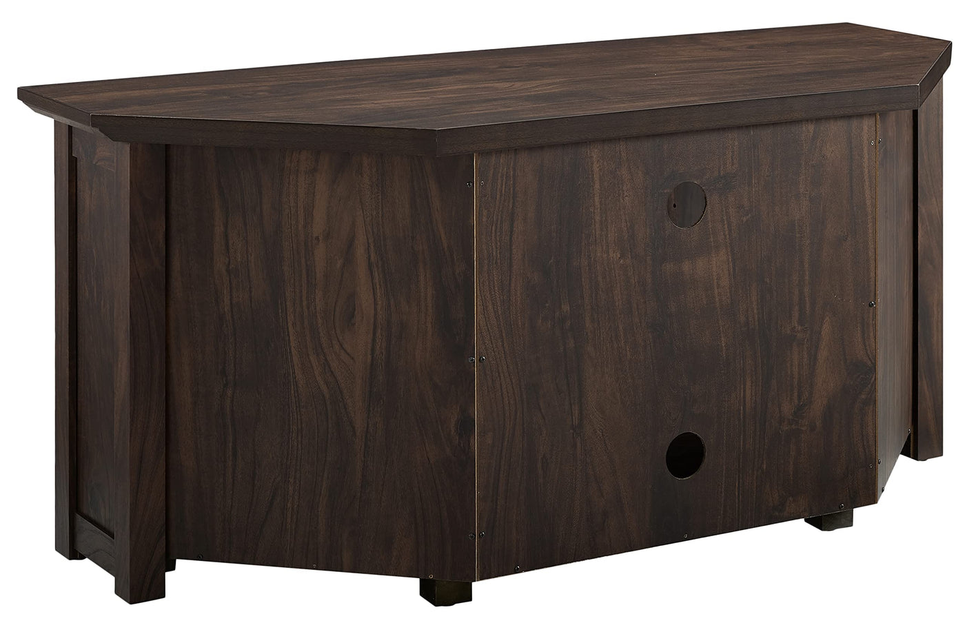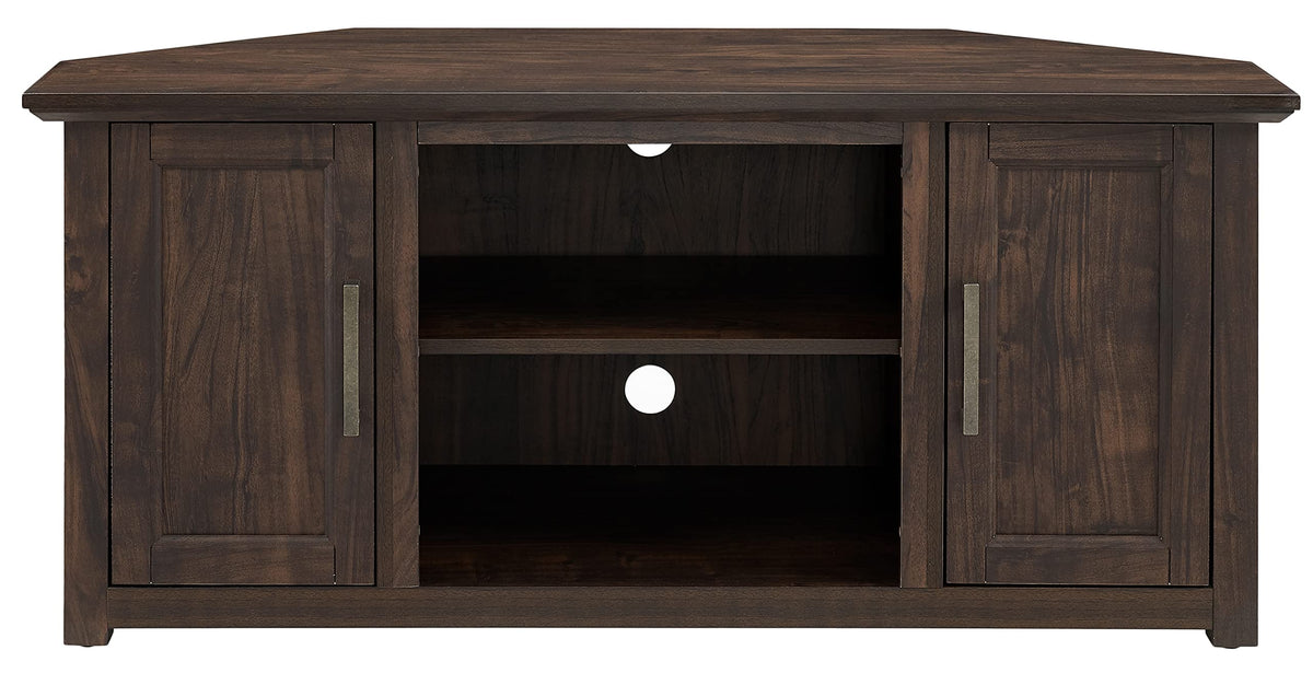 Ideal for smaller living spaces, the Camden 48” Corner TV Stand tucks neatly into any corner. Featuring two cabinets with an adjustable shelf in each, this stand is ready to corral your books, video games, or other media. The open storage in the center offers an adjustable and removable shelf with two pre-cut holes in the back for cable management. Sized to fit most TV’s up to 50 inches, the Camden 48” Corner TV Stand exudes rustic style with the look of wood-grain and substantial metal hardware.