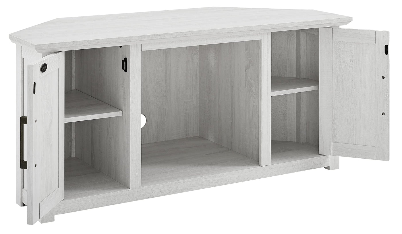 Ideal for smaller living spaces, the Camden 48” Corner TV Stand tucks neatly into any corner. Featuring two cabinets with an adjustable shelf in each, this stand is ready to corral your books, video games, or other media. The open storage in the center offers an adjustable and removable shelf with two pre-cut holes in the back for cable management. Sized to fit most TV’s up to 50 inches, the Camden 48” Corner TV Stand exudes rustic style with the look of wood-grain and substantial metal hardware.