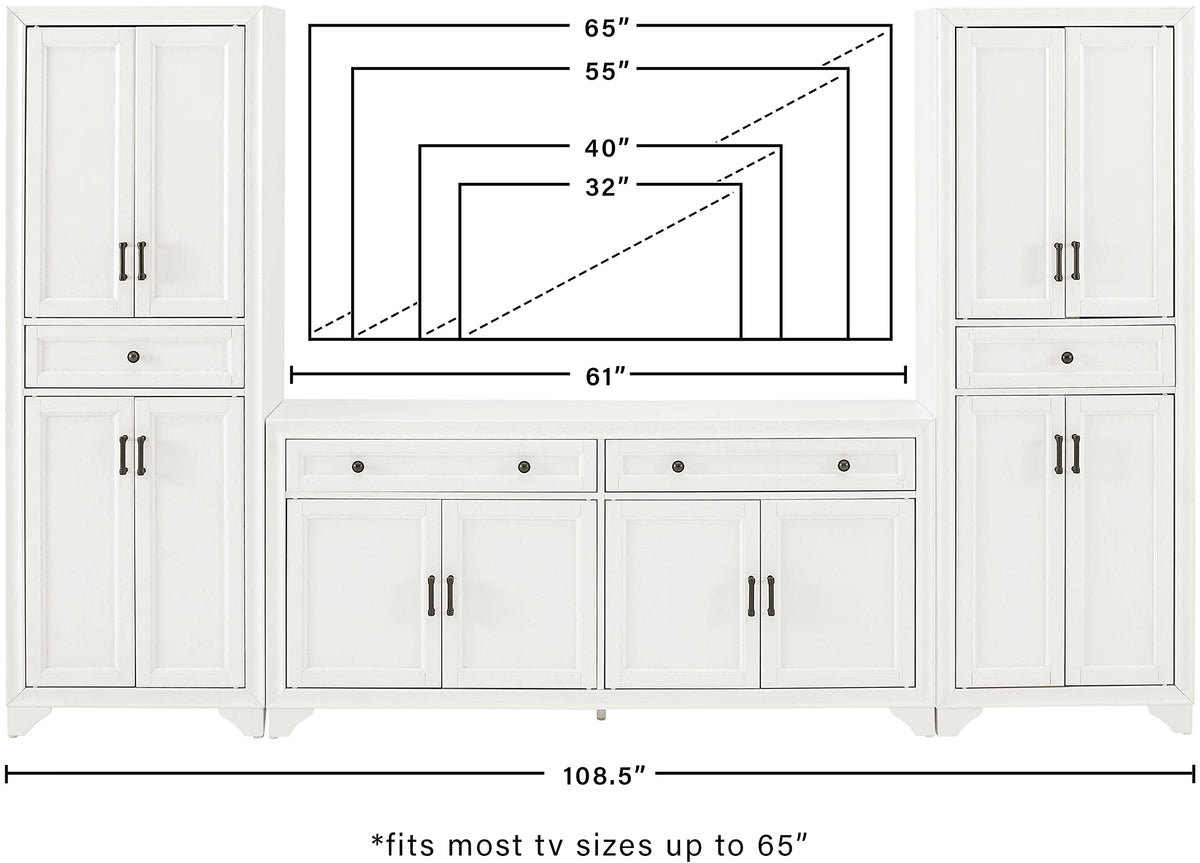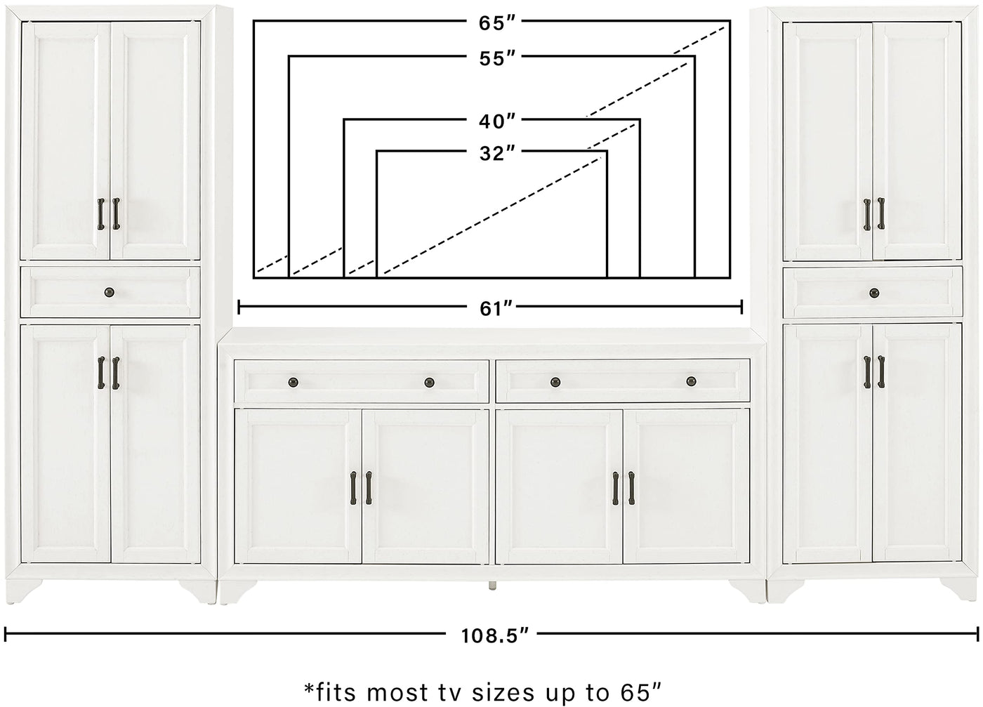 Crosley Furniture Tara 3-Piece Entertainment Center with TV Stand, Storage Cabinets, and Adjustable Shelves, Distressed White