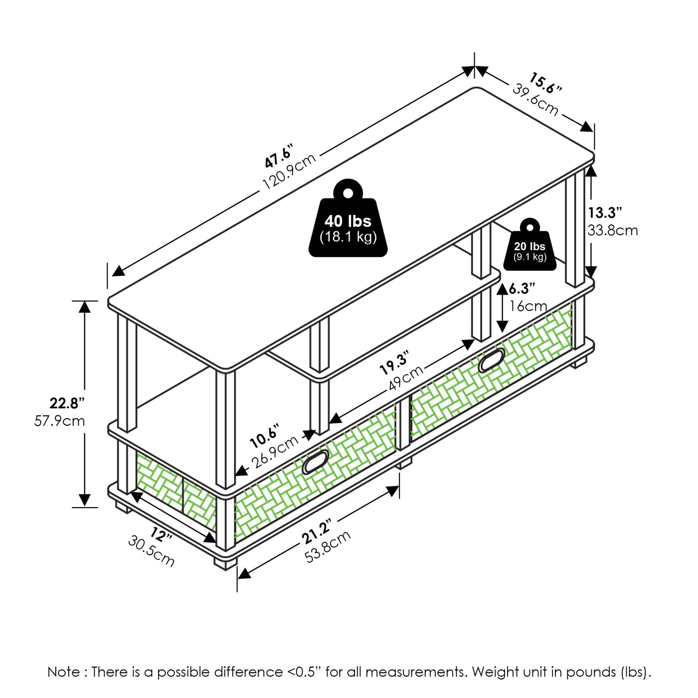 Furinno JAYA Large TV Stand for up to 55-Inch TV with Storage Bin is a perfect fits into your modern simple lifestyle. It features the large top panel which holds up to 55-Inch Flat Panel TV. There are open display shelves to hold your entertainment equipment and two compartments with doors for your loose stuff such as CDs, DVDs and games. It is easy to assemble, lightweight and space saving. The manufacturing process complies with the green rules of production. There is no foul smell, durable and the material is the most stable amongst the medium density composite woods. The PVC tubes are made from recycled plastic and is tested for its durability. A simple attitude towards lifestyle is reflected directly on the design of Furinno Furniture, creating a trend of simply nature. All the products are produced and assembled 100-percent in Malaysia with 95% - 100% recycled materials. Care instructions: wipe clean with clean damped cloth. Avoid using harsh chemicals. Pictures are for illustration purpose. All decor items are not included in this offer.