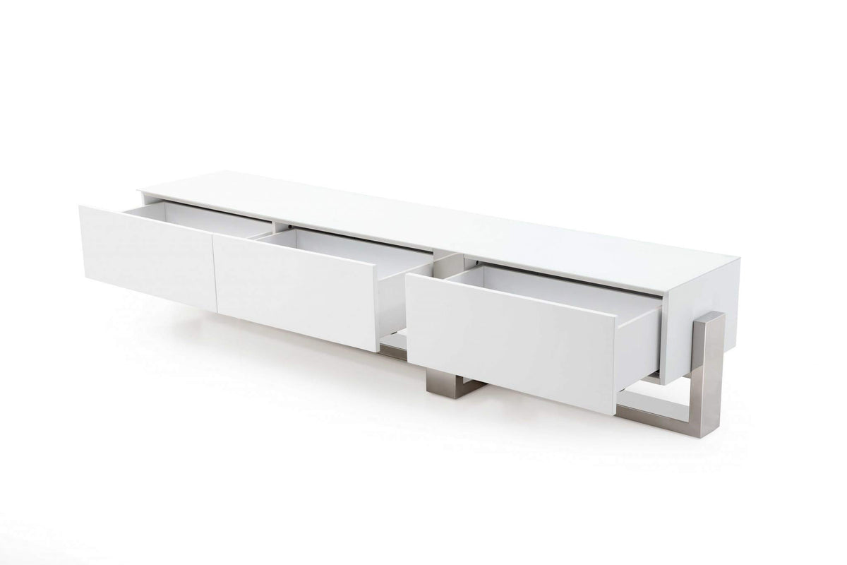 Create the ideal blend of style, function and design with this contemporary style TV stand. It is an elegant piece, made of materials. Its white color and glossy finish are nothing to scoff at either. This TV stand is an ultimate instrument to present some freshness in your place. This TV stand also combines being overall impressive with being practical. Beyond being perfect for your television, there is no better place for your video collections, or video games, board games, electronics or multimedia accessories. This TV stand would be ideal for your living room, for example. You can combine it with other decorations to get an ideal look for your space.