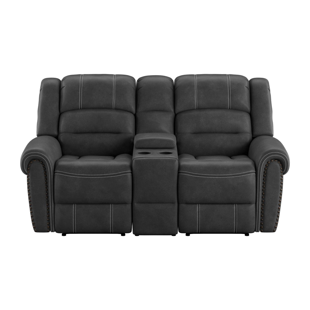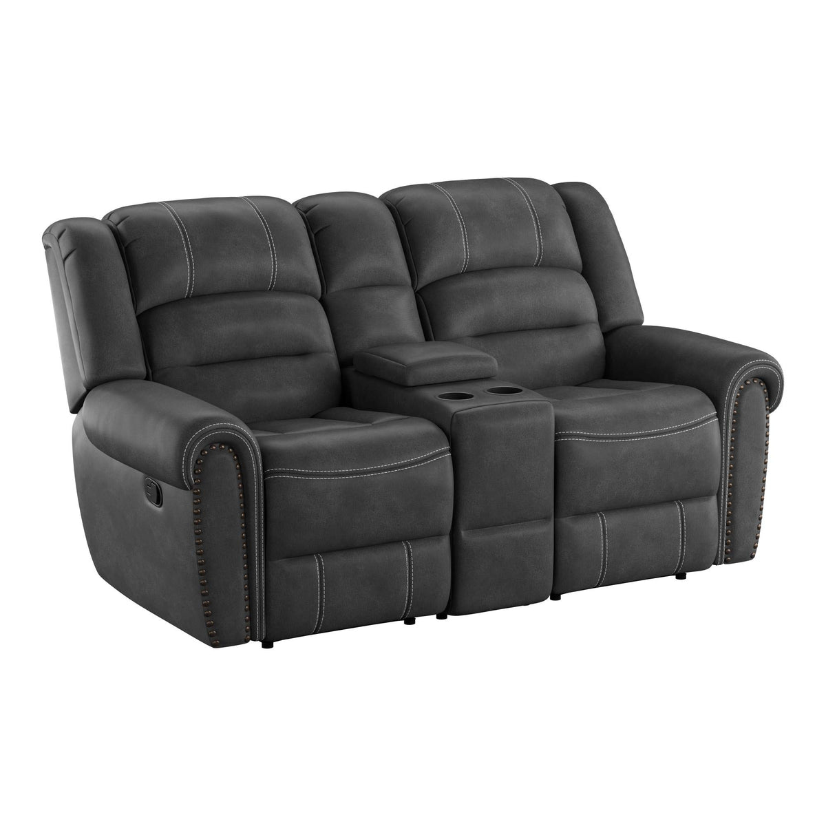 The Mason reclining console loveseat from Madrona Burke is a gliding loveseat that disproves the idea that good looks must be sacrificed for comfort. The rolled arms, nailhead trim, contrast baseball stitching, and weathered texture of faux leather create an enhanced, yet comfortable look.