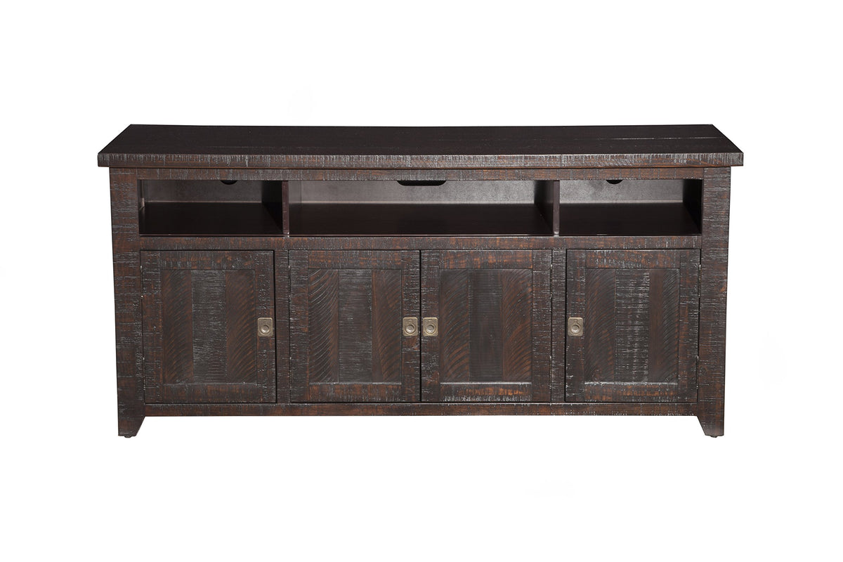The Coffee Plantation Tv Stand Is A Transitional Style Tv Stand Finished In A Beautiful Dark Espresso. Constructed From Solid New Zealand Radiata Pine Gives It The Look Of Reclaimed Lumber With Rough-Hewn Saw And Distress Marks. Three (3) Large, Open Component Cubbies Allow For Plenty Of Space To Store Tv, Video, Audio And Video Game Components. A Total Of Four (4) Doors Give Access To Three Cabinets, One Large Middle Cabinet And Two Smaller Cabinets On Each Side. Each Cabinet Features One Adjustable And Removable Shelf Along With Vertical Wire Management Cutouts. The Recessed Campaign-Style Door Pulls Feature A Complementing Brass Finish To The Espresso Finish. Ideal For Most 65" Flat Panel Tvs And Up To 70". Anti-Tip Kit Added For Safety. Easy To Assemble. Assembled Product Dimensions: 65" L X 30" H X 19" D