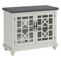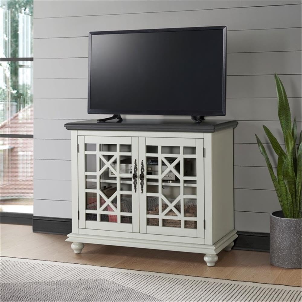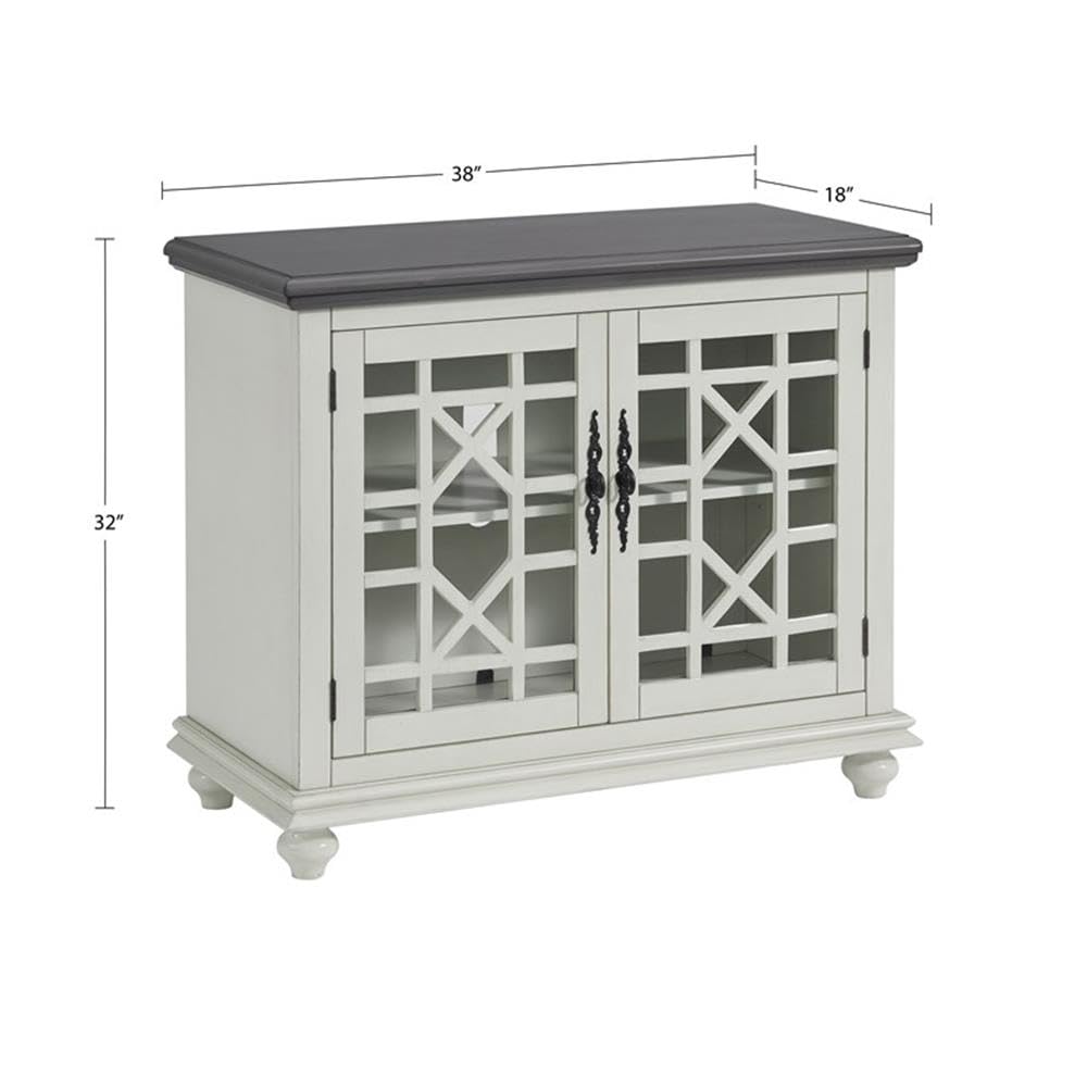 The Elegant Small Spaces collection is designed for with functionality in mind to be used as an occasional or accent cabinet in any room in the home or as a TV Stand. This piece features a beautiful painted finish with sophisticated transitional styling inspired by design cues taken from Parisian antique markets. Elegant trellis details on the two glass doors, intricately cast door pulls, turned bun feet, and architectural moldings are all blended together for an exquisite look. Each piece is slightly distressed with just the right amount of rub through at the edges to make it seem like this was a piece handed down through generations. Features the Lightning Fast Assembly System which allows for assembly in under 10 minutes. One large removable and adjustable shelf allows provide versatile storage options for audio, video, gaming components. Vertical wire management cutouts allow for easy access with multiple shelf configurations. Ideal for TVs up to 42 inches. Anti-tip kit added for safety. Assembled Dimensions: 38" W x 32" H x 18" D.Features :- Two tone finish with White finish and Grey finish Top- Features the no tools Lightning Fast Assembly System which allows for assembly in under 10 minutes- Versatile design allows for the piece to be used as a small TV stand, as an accent or occasional cabinet, or credenza in the entryway, hallway, living room, dining room.- Design features include slightly distressed painted finish, intricately cast door pulls, turned bun feet, and architectural moldings- The cabinet features two tempered glass doors with an elegant trellis design and an adjustable shelf allowing for plenty of storage for TV components, games, books, and other belongings; Vertical cable management cutouts- Ideal for most flat panel TVs up to 42 inches.Specifications :- Product Dimensions : 38" W x 32" H x 18" D