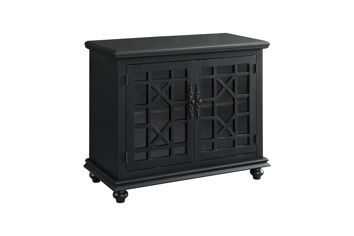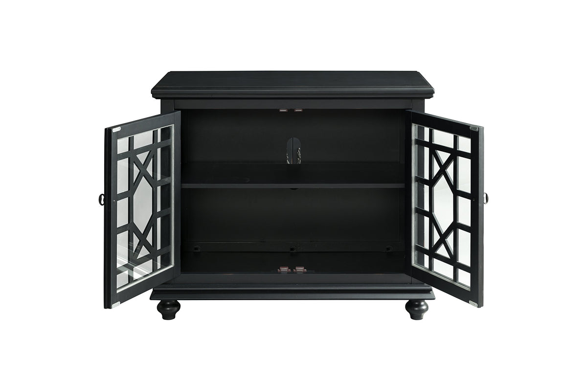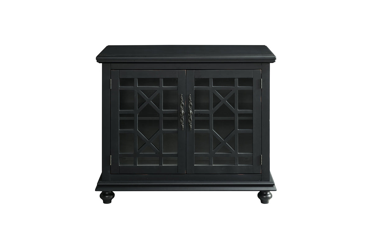 The Elegant Small Spaces Collection Is Designed For With Functionality In Mind To Be Used As An Occasional Or Accent Cabinet In Any Room In The Home Or As A Tv Stand. This Piece Features A Beautiful Antique Black Painted Finish With Sophisticated Transitional Styling Inspired By Design Cues Taken From Parisian Antique Markets. Elegant Trellis Details On The Two Glass Doors, Intricately Cast Door Pulls, Turned Bun Feet, And Architectural Moldings Are All Blended Together For An Exquisite Look. Each Piece Is Slightly Distressed With Just The Right Amount Of Rub Through At The Edges To Make It Seem Like This Was A Piece Handed Down Through Generations. Features The Lightning Fast Assembly System Which Allows For Assembly In Under 10 Minutes. One Large Removable And Adjustable Shelf Provides Versatile Storage Options For Tv Components, Games, Books, And Other Belongings . Vertical Wire Management Cutouts Allow For Easy Access With Multiple Shelf Configurations. Ideal For Tvs Up To 42 Inches. Anti-Tip Kit Added For Safety. Assembled Dimensions: 38" W X 32" H X 18" D. Product Materials: Mdf, Acacia Wood, Glass.