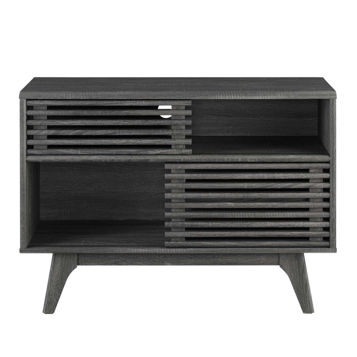 Tap into mid-century aesthetics with the Render Display Stand. Render features smooth walnut grain veneer, four solid wood tapered legs, four storage spaces with an adjustable shelf in the lower right section, non-marking foam foot pads, and dual slatted sliding doors for sophisticated living room or entryway storage. Complete with cable management holes on both sides, Render’s contemporary linear style is the perfect display stand for books, magazines, pictures, table lamps, and indoor plants.