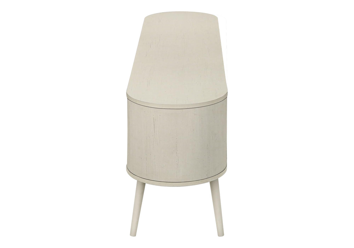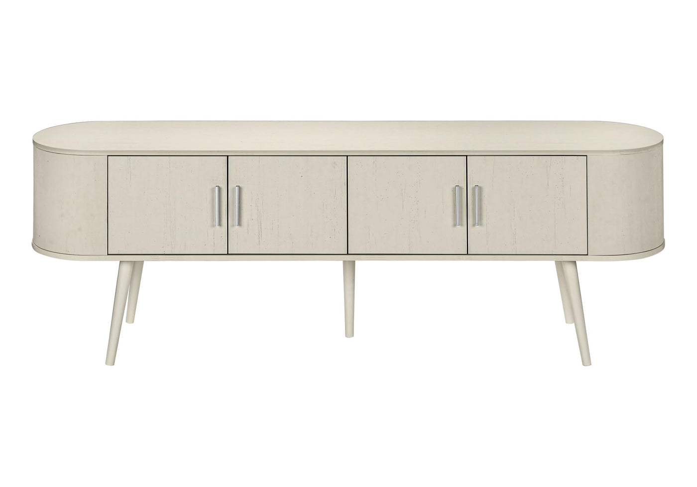 Elevate your living space with this stunning 72 inch long tv stand in a chic antique white laminate finish. With an easy to clean top and 4 cabinet doors, this console offers ample storage for an organized media entertainment center. The curved sides and sleek handles in silver add a touch of retro style, while the matching antique white solid wood legs provide durability and stability. Designed with 2 hidden cable management holes behind the closed storage, this tv stand keeps your entertainment area looking neat and clutter-free. The durably designed piece is easy to assemble with step by step illustrated instructions and all the necessary hardware included. Perfect for the fashion-forward customer looking to add a contemporary or mid-century flair to their bedroom or living room. Backed by a 5 year limited warranty, this solidly constructed storage cabinet is not only functional but brings fashionable style for the trendiest decors.