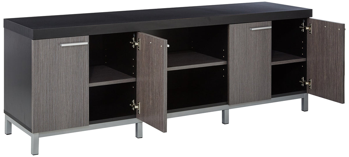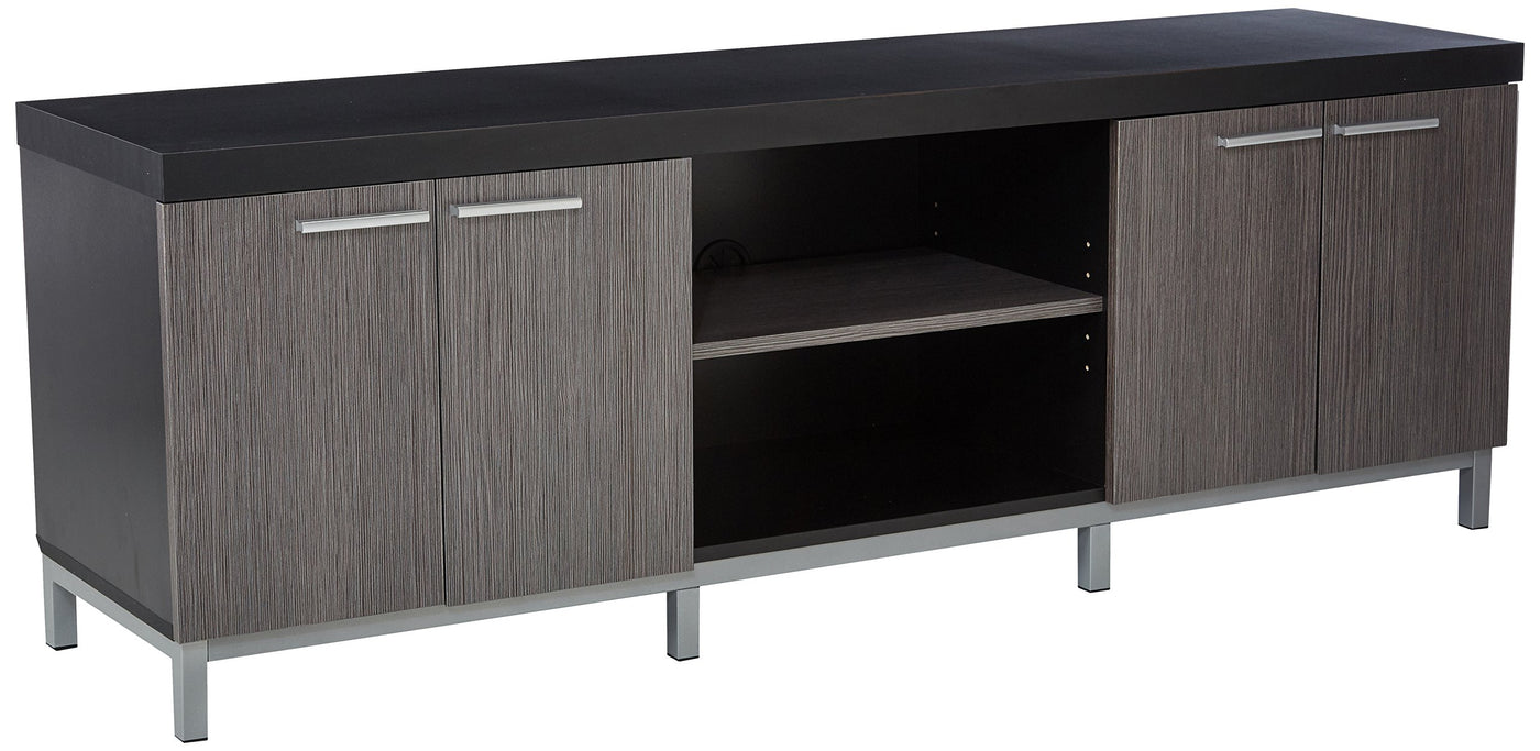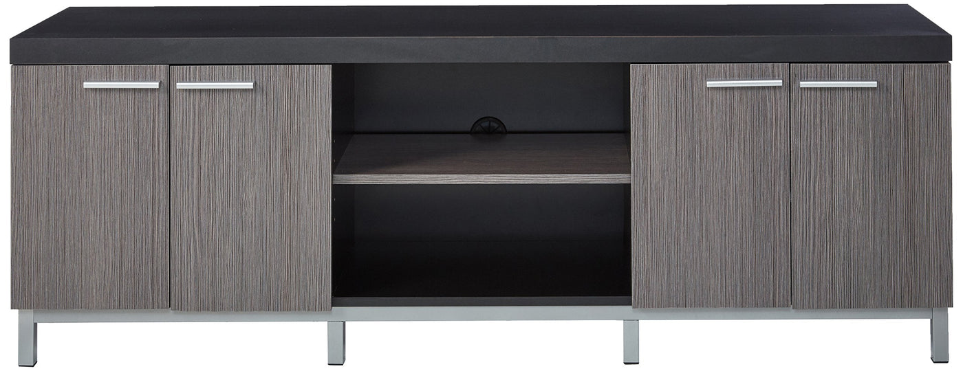 Complete the look of your living space with this contemporary two tone TV console. The thick paneled black frame paired with grey cabinets are accented with sleek silver colored handles and supported by stylish silver legs. Featuring two open storage shelves and two double door cabinets, this TV stand will meet all your media storage needs in style.
