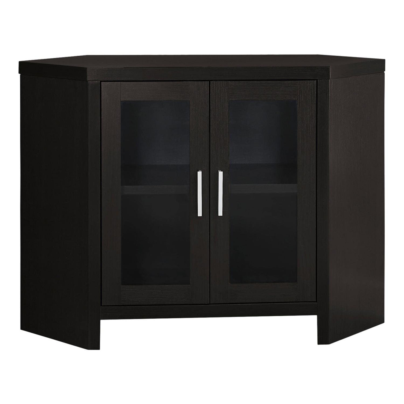 In A Corner Design With Two Glass Cabinet Doors To Keep Components Organized, Space Saving Is No Issue. This Dark Brown, Espresso Tv Stand Is The Versatile Media Storage Solution You Need In The Living Room Of Your Small Home, Condo, Apartment Or Dorm Room. Freeing Up Valuable Space, This Unit Accommodates All Tv Sizes Equipped With A Center Stand. Keep In Mind, All The Cables Of Your Electronic Components Can Be Kept Organized And Hidden Behind The Glass Doors With Help From The Fixed Shelf.