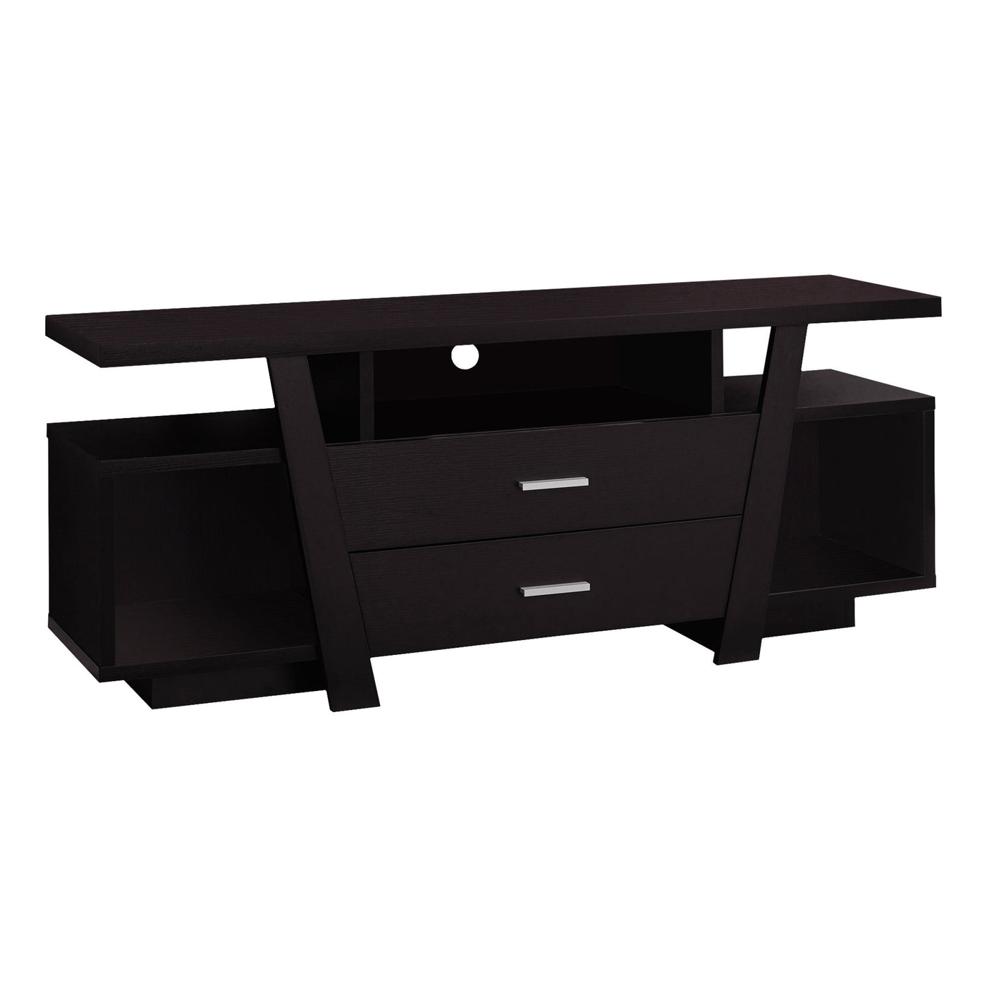 Grab Your Guest'S Attention With The Contemporary Styling Of This 60" Long Tv Stand. Constructed With Thick Panels In A Warm Cappuccino Finish, This Stand Features Open Concept Shelving And Two Storage Drawers Ideal For Keeping Your Electronic Components And Accessories Organized. Featuring Symmetrical Lines And A Unique Flair This Tv Stand Is A Must Have In Any Modern Entertainment Room.