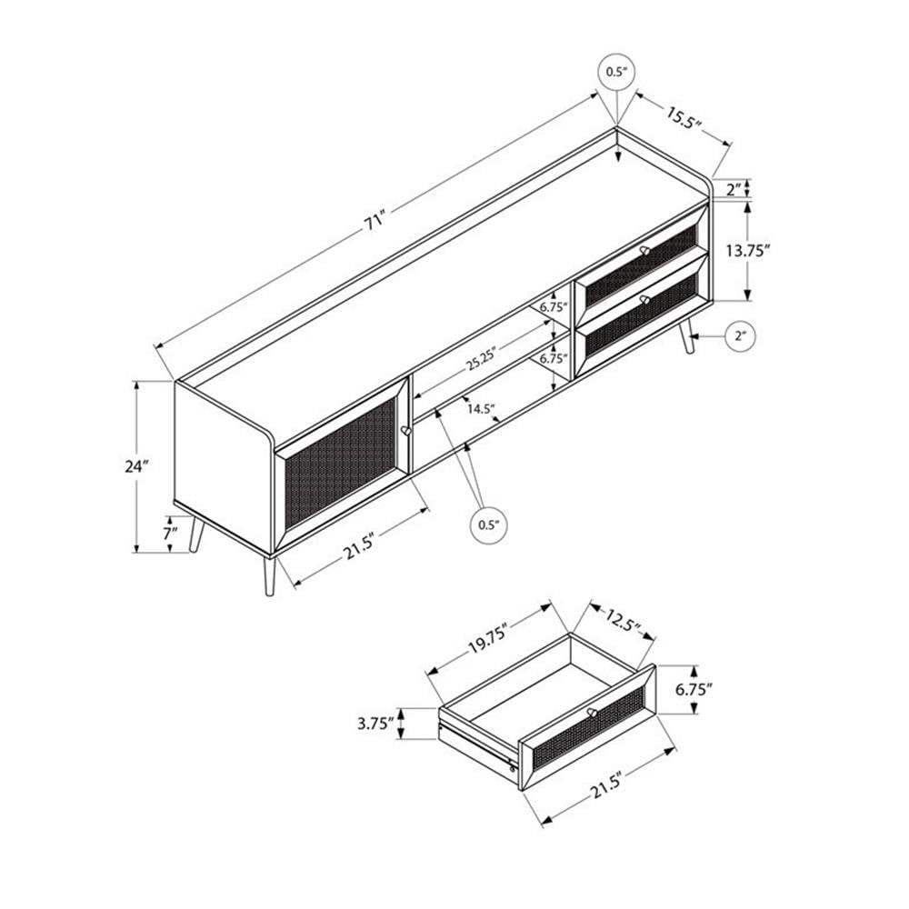 This fabulous transitional style, 72 inch tv stand is the perfect piece of furniture to hold your large screen TV. It is a media entertainment center with 1 closed cabinet and two drawers to conveniently store all of your media devices and accessories. The walnut laminate finish and solid wood legs add a beautiful touch to your living room or bedroom, and its rattan panels add a fashionable casual style. This tv console features 2 wire management holes behind the fixed open shelf for clutter-free organization, and a 5 year limited warranty for manufacturer's defects, to ensure lasting use of this durably designed furniture piece. Easy to assemble, with full illustrated instructions and hardware included, you will love this upgrade to your living space.