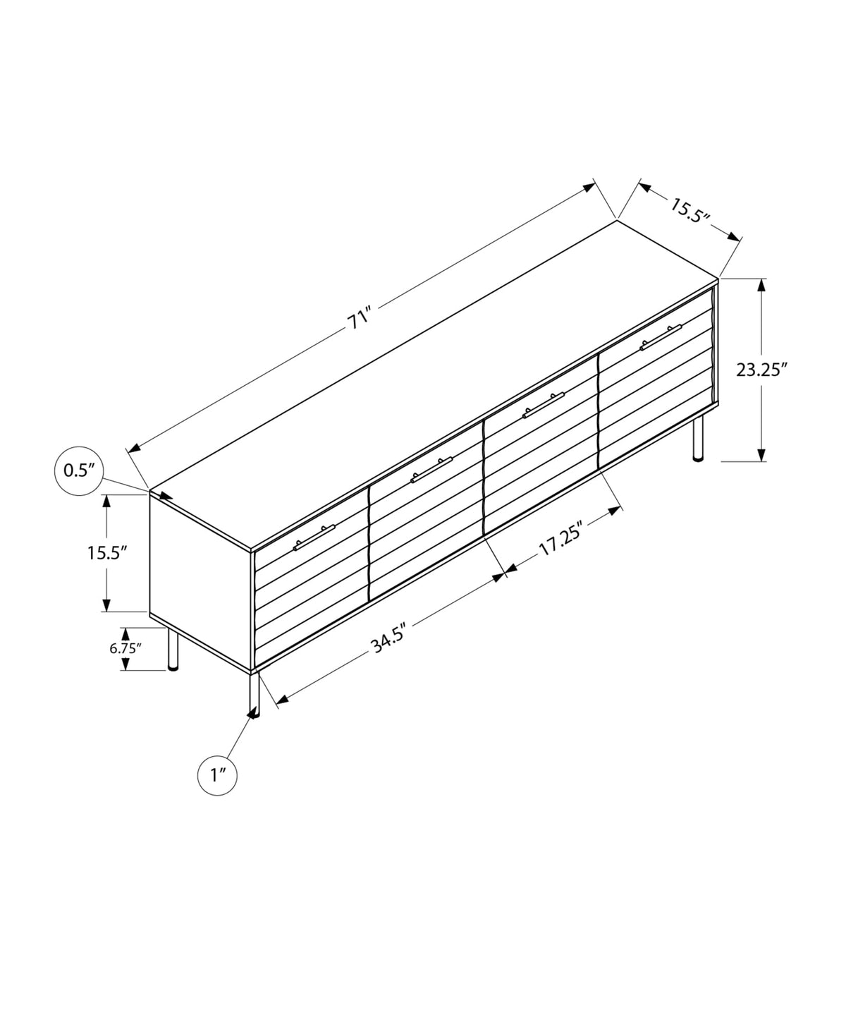 SLEEK AND TRENDY 72 INCH TV STAND: With a rich dark brown laminate, smooth wood-look finish on all sides, this 72 inch TV console has a timeless transitional style that includes a rippled front design to elevate your entertainment space in fashionable style. | STORAGE OPTIONS: Offering plenty of closed storage space to organize your media essentials behind 4 doors that house 2 large storage cabinets with adjustable shelves inside. | SOLID CONSTRUCTION: Durably designed black metal legs with an industrial inspiration, an easy to clean top, and 4 hidden cable management holes in the back to keep everything tidy and out of sight. | 5 YEAR WARRANTY: This contemporary media entertainment center includes a 5 year limited warranty against any defects, ensuring value for your investment. | EASY TO ASSEMBLE: The illustrated, step by step instructions and all hardware included makes for an easy assembly, ready to setup and enjoy in your living room, bedroom, or family room.
